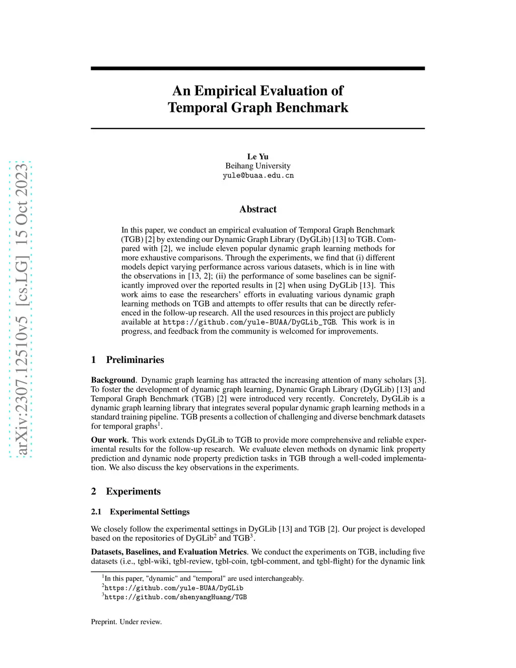 In this paper, we conduct an empirical evaluation of Temporal Graph Benchmark (TGB) by extending our Dynamic Graph Library (DyGLib) to TGB. Compared with TGB, we include eleven popular dynamic graph learning methods for more exhaustive comparisons. Through the experiments, we find that (1) different models depict varying performance across various datasets, which is in line with previous observations; (2) the performance of some baselines can be significantly improved over the reported results in TGB when using DyGLib. This work aims to ease the researchers' efforts in evaluating various dynamic graph learning methods on TGB and attempts to offer results that can be directly referenced in the follow-up research. All the used resources in this project are publicly available at https://github.com/yule-BUAA/DyGLib_TGB. This work is in progress, and feedback from the community is welcomed for improvements.