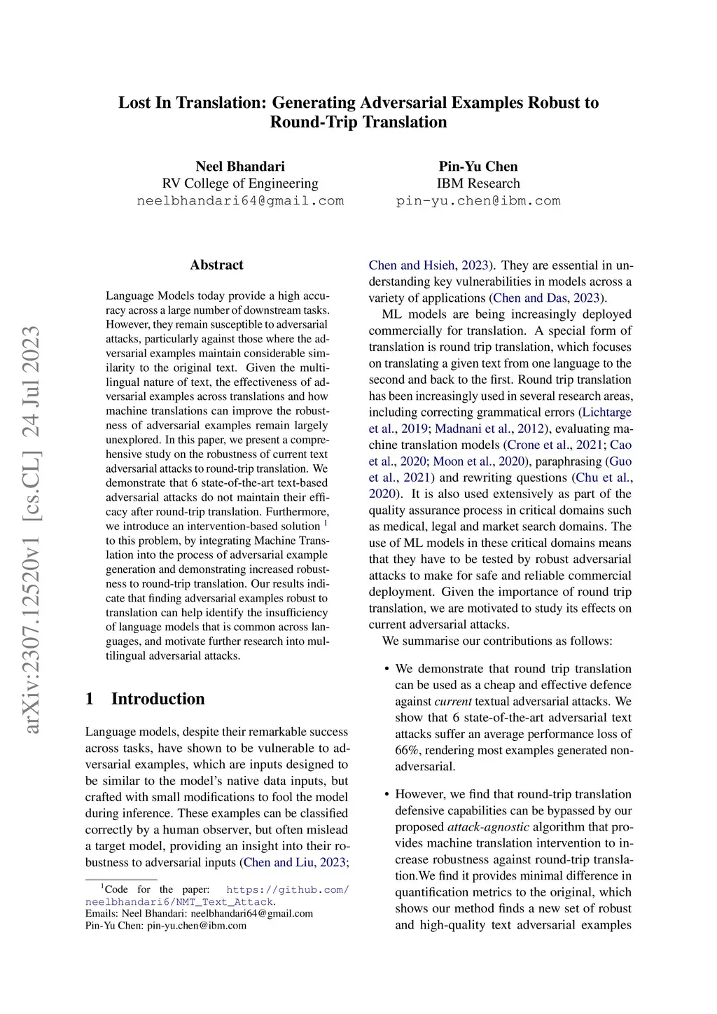 Language Models today provide a high accuracy across a large number of downstream tasks. However, they remain susceptible to adversarial attacks, particularly against those where the adversarial examples maintain considerable similarity to the original text. Given the multilingual nature of text, the effectiveness of adversarial examples across translations and how machine translations can improve the robustness of adversarial examples remain largely unexplored. In this paper, we present a comprehensive study on the robustness of current text adversarial attacks to round-trip translation. We demonstrate that 6 state-of-the-art text-based adversarial attacks do not maintain their efficacy after round-trip translation. Furthermore, we introduce an intervention-based solution to this problem, by integrating Machine Translation into the process of adversarial example generation and demonstrating increased robustness to round-trip translation. Our results indicate that finding adversarial examples robust to translation can help identify the insufficiency of language models that is common across languages, and motivate further research into multilingual adversarial attacks.