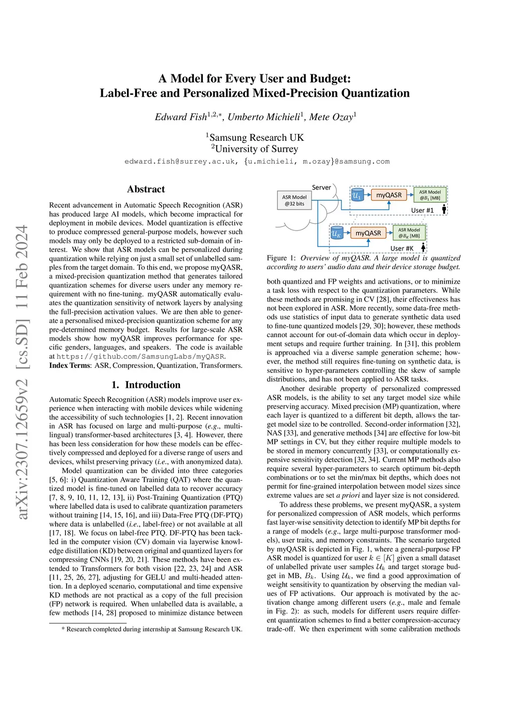 Recent advancement in Automatic Speech Recognition (ASR) has produced large AI models, which become impractical for deployment in mobile devices. Model quantization is effective to produce compressed general-purpose models, however such models may only be deployed to a restricted sub-domain of interest. We show that ASR models can be personalized during quantization while relying on just a small set of unlabelled samples from the target domain. To this end, we propose myQASR, a mixed-precision quantization method that generates tailored quantization schemes for diverse users under any memory requirement with no fine-tuning. myQASR automatically evaluates the quantization sensitivity of network layers by analysing the full-precision activation values. We are then able to generate a personalised mixed-precision quantization scheme for any pre-determined memory budget. Results for large-scale ASR models show how myQASR improves performance for specific genders, languages, and speakers.