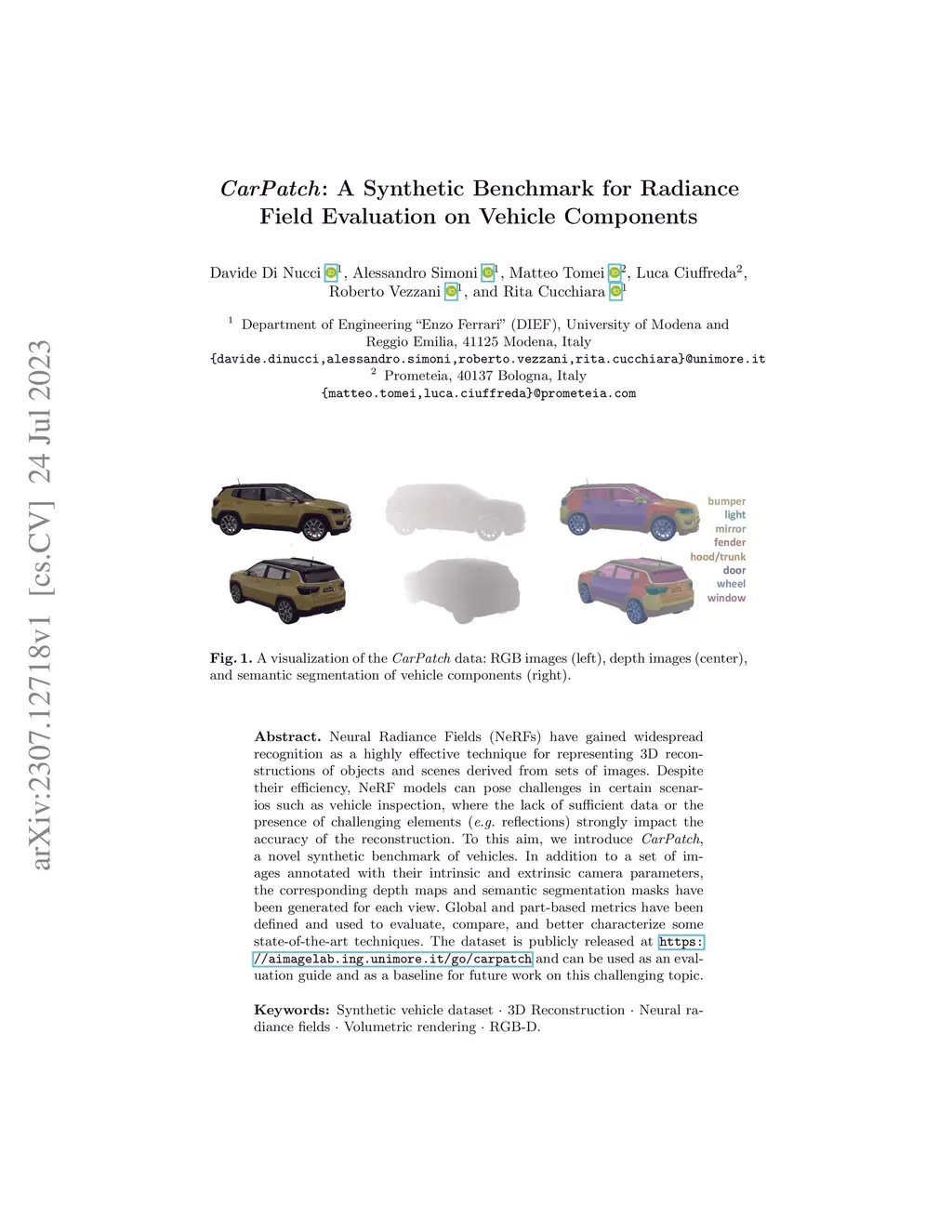 Neural Radiance Fields (NeRFs) have gained widespread recognition as a highly effective technique for representing 3D reconstructions of objects and scenes derived from sets of images. Despite their efficiency, NeRF models can pose challenges in certain scenarios such as vehicle inspection, where the lack of sufficient data or the presence of challenging elements (e.g. reflections) strongly impact the accuracy of the reconstruction. To this aim, we introduce CarPatch, a novel synthetic benchmark of vehicles. In addition to a set of images annotated with their intrinsic and extrinsic camera parameters, the corresponding depth maps and semantic segmentation masks have been generated for each view. Global and part-based metrics have been defined and used to evaluate, compare, and better characterize some state-of-the-art techniques. The dataset is publicly released at https://aimagelab.ing.unimore.it/go/carpatch and can be used as an evaluation guide and as a baseline for future work on this challenging topic.