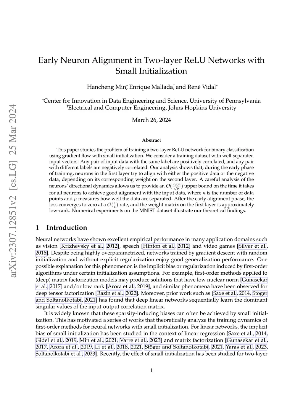 This paper studies the problem of training a two-layer ReLU network for binary classification using gradient flow with small initialization. We consider a training dataset with well-separated input vectors: Any pair of input data with the same label are positively correlated, and any pair with different labels are negatively correlated. Our analysis shows that, during the early phase of training, neurons in the first layer try to align with either the positive data or the negative data, depending on its corresponding weight on the second layer. A careful analysis of the neurons' directional dynamics allows us to provide an upper bound on the time it takes for all neurons to achieve good alignment with the input data, where is the number of data points and measures how well the data are separated. After the early alignment phase, the loss converges to zero at a rate, and the weight matrix on the first layer is approximately low-rank. Numerical experiments on the MNIST dataset illustrate our theoretical findings.