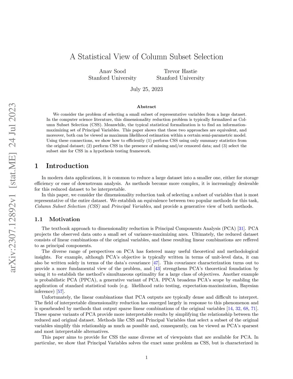 We consider the problem of selecting a small subset of representative variables from a large dataset. In the computer science literature, this dimensionality reduction problem is typically formalized as Column Subset Selection (CSS). Meanwhile, the typical statistical formalization is to find an information-maximizing set of Principal Variables. This paper shows that these two approaches are equivalent, and moreover, both can be viewed as maximum likelihood estimation within a certain semi-parametric model. Using these connections, we show how to efficiently (1) perform CSS using only summary statistics from the original dataset; (2) perform CSS in the presence of missing and/or censored data; and (3) select the subset size for CSS in a hypothesis testing framework.