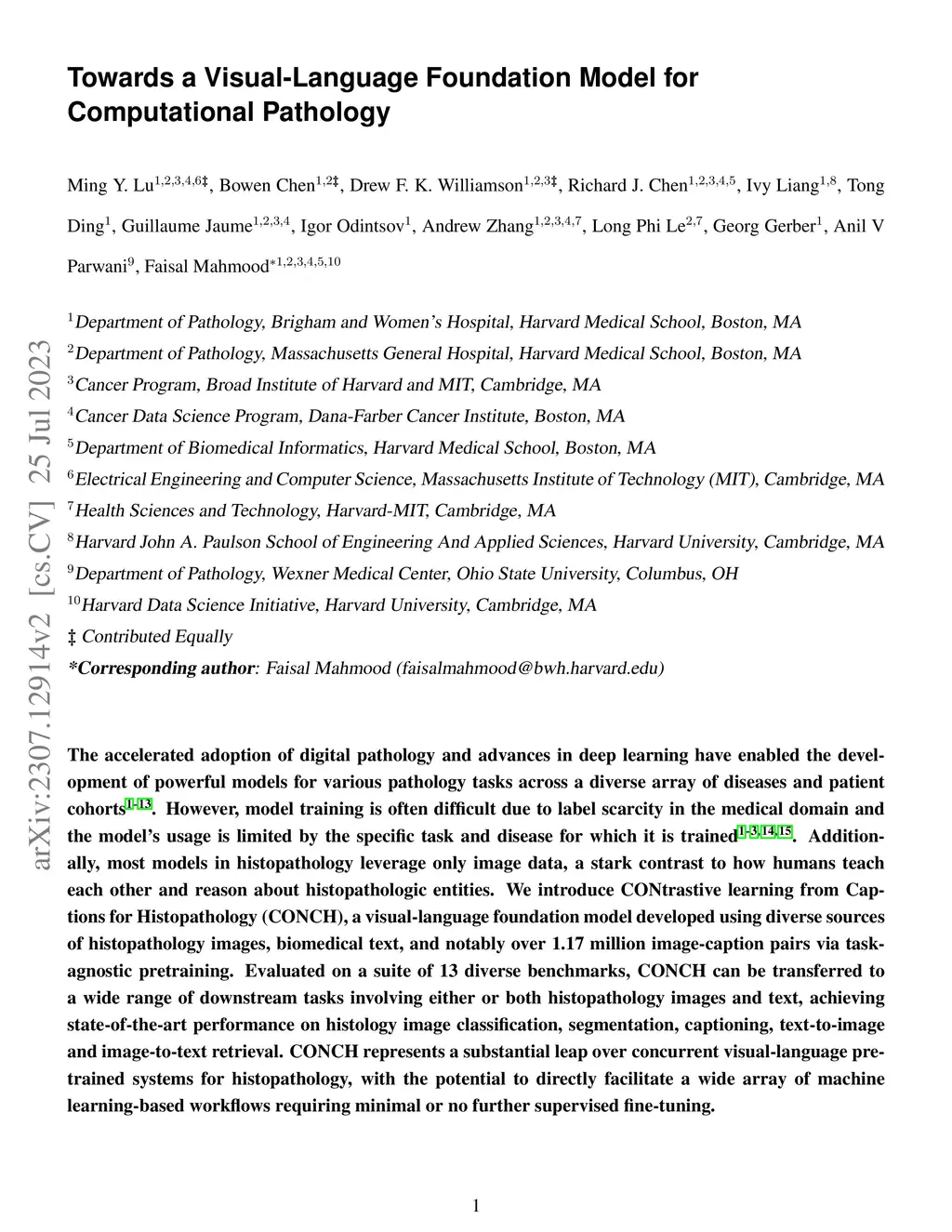 The accelerated adoption of digital pathology and advances in deep learning have enabled the development of powerful models for various pathology tasks across a diverse array of diseases and patient cohorts. However, model training is often difficult due to label scarcity in the medical domain and the model's usage is limited by the specific task and disease for which it is trained. Additionally, most models in histopathology leverage only image data, a stark contrast to how humans teach each other and reason about histopathologic entities. We introduce CONtrastive learning from Captions for Histopathology (CONCH), a visual-language foundation model developed using diverse sources of histopathology images, biomedical text, and notably over 1.17 million image-caption pairs via task-agnostic pretraining. Evaluated on a suite of 13 diverse benchmarks, CONCH can be transferred to a wide range of downstream tasks involving either or both histopathology images and text, achieving state-of-the-art performance on histology image classification, segmentation, captioning, text-to-image and image-to-text retrieval. CONCH represents a substantial leap over concurrent visual-language pretrained systems for histopathology, with the potential to directly facilitate a wide array of machine learning-based workflows requiring minimal or no further supervised fine-tuning.