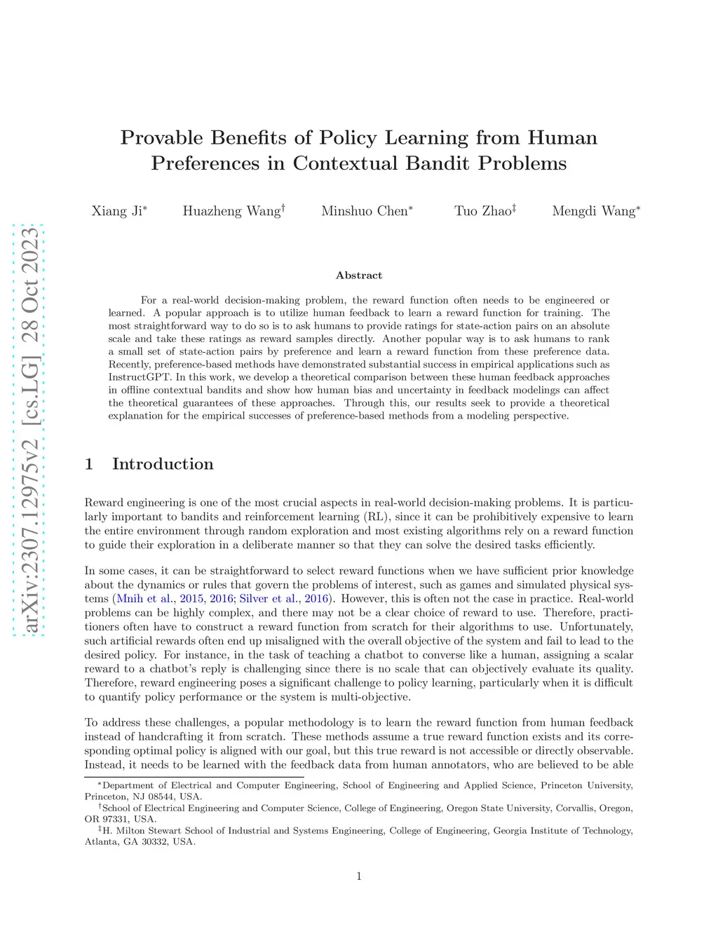 For a real-world decision-making problem, the reward function often needs to be engineered or learned. A popular approach is to utilize human feedback to learn a reward function for training. The most straightforward way to do so is to ask humans to provide ratings for state-action pairs on an absolute scale and take these ratings as reward samples directly. Another popular way is to ask humans to rank a small set of state-action pairs by preference and learn a reward function from these preference data. Recently, preference-based methods have demonstrated substantial success in empirical applications such as InstructGPT. In this work, we develop a theoretical comparison between these human feedback approaches in offline contextual bandits and show how human bias and uncertainty in feedback modelings can affect the theoretical guarantees of these approaches. Through this, our results seek to provide a theoretical explanation for the empirical successes of preference-based methods from a modeling perspective.