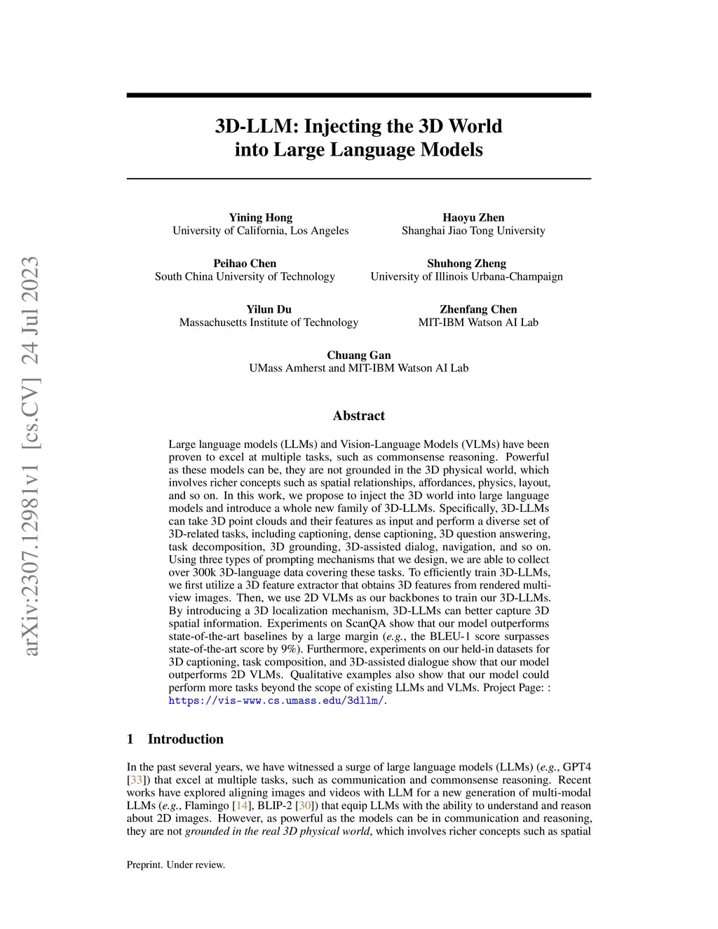 Large language models (LLMs) and Vision-Language Models (VLMs) have been proven to excel at multiple tasks, such as commonsense reasoning. Powerful as these models can be, they are not grounded in the 3D physical world, which involves richer concepts such as spatial relationships, affordances, physics, layout, and so on. In this work, we propose to inject the 3D world into large language models and introduce a whole new family of 3D-LLMs. Specifically, 3D-LLMs can take 3D point clouds and their features as input and perform a diverse set of 3D-related tasks, including captioning, dense captioning, 3D question answering, task decomposition, 3D grounding, 3D-assisted dialog, navigation, and so on. Using three types of prompting mechanisms that we design, we are able to collect over 300k 3D-language data covering these tasks. To efficiently train 3D-LLMs, we first utilize a 3D feature extractor that obtains 3D features from rendered multi- view images. Then, we use 2D VLMs as our backbones to train our 3D-LLMs. By introducing a 3D localization mechanism, 3D-LLMs can better capture 3D spatial information. Experiments on ScanQA show that our model outperforms state-of-the-art baselines by a large margin (e.g., the BLEU-1 score surpasses state-of-the-art score by 9%). Furthermore, experiments on our held-in datasets for 3D captioning, task composition, and 3D-assisted dialogue show that our model outperforms 2D VLMs. Qualitative examples also show that our model could perform more tasks beyond the scope of existing LLMs and VLMs. Project Page: : https://vis-www.cs.umass.edu/3dllm/.