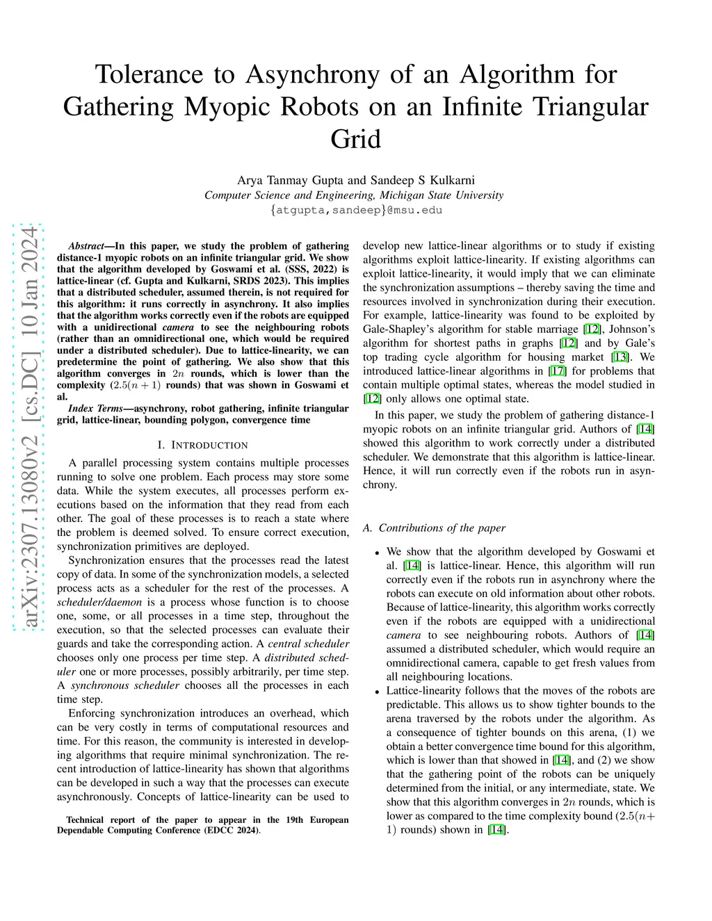In this paper, we study the problem of gathering distance-1 myopic robots on an infinite triangular grid. We show that the algorithm developed by Goswami et al. (SSS, 2022) is lattice-linear (cf. Gupta and Kulkarni, SRDS 2023). This implies that a distributed scheduler, assumed therein, is not required for this algorithm: it runs correctly in asynchrony. It also implies that the algorithm works correctly even if the robots are equipped with a unidirectional \textit{camera} to see the neighbouring robots (rather than an omnidirectional one, which would be required under a distributed scheduler). Due to lattice-linearity, we can predetermine the point of gathering. We also show that this algorithm converges in rounds, which is lower than the complexity ( rounds) that was shown in Goswami et al.
