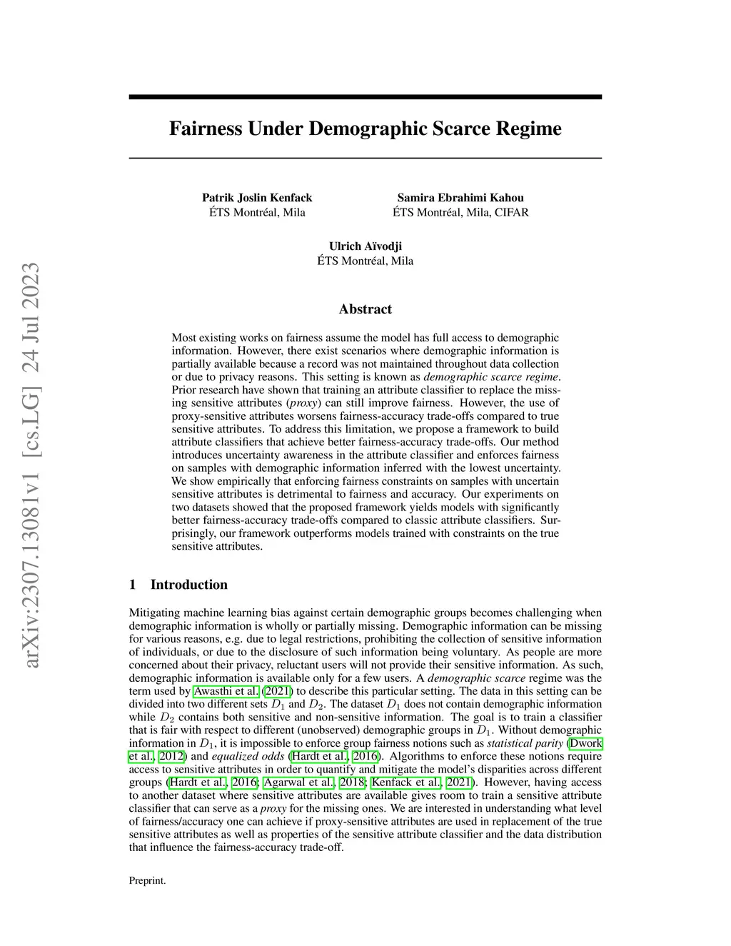 Most existing works on fairness assume the model has full access to demographic information. However, there exist scenarios where demographic information is partially available because a record was not maintained throughout data collection or due to privacy reasons. This setting is known as demographic scarce regime. Prior research have shown that training an attribute classifier to replace the missing sensitive attributes (proxy) can still improve fairness. However, the use of proxy-sensitive attributes worsens fairness-accuracy trade-offs compared to true sensitive attributes. To address this limitation, we propose a framework to build attribute classifiers that achieve better fairness-accuracy trade-offs. Our method introduces uncertainty awareness in the attribute classifier and enforces fairness on samples with demographic information inferred with the lowest uncertainty. We show empirically that enforcing fairness constraints on samples with uncertain sensitive attributes is detrimental to fairness and accuracy. Our experiments on two datasets showed that the proposed framework yields models with significantly better fairness-accuracy trade-offs compared to classic attribute classifiers. Surprisingly, our framework outperforms models trained with constraints on the true sensitive attributes.