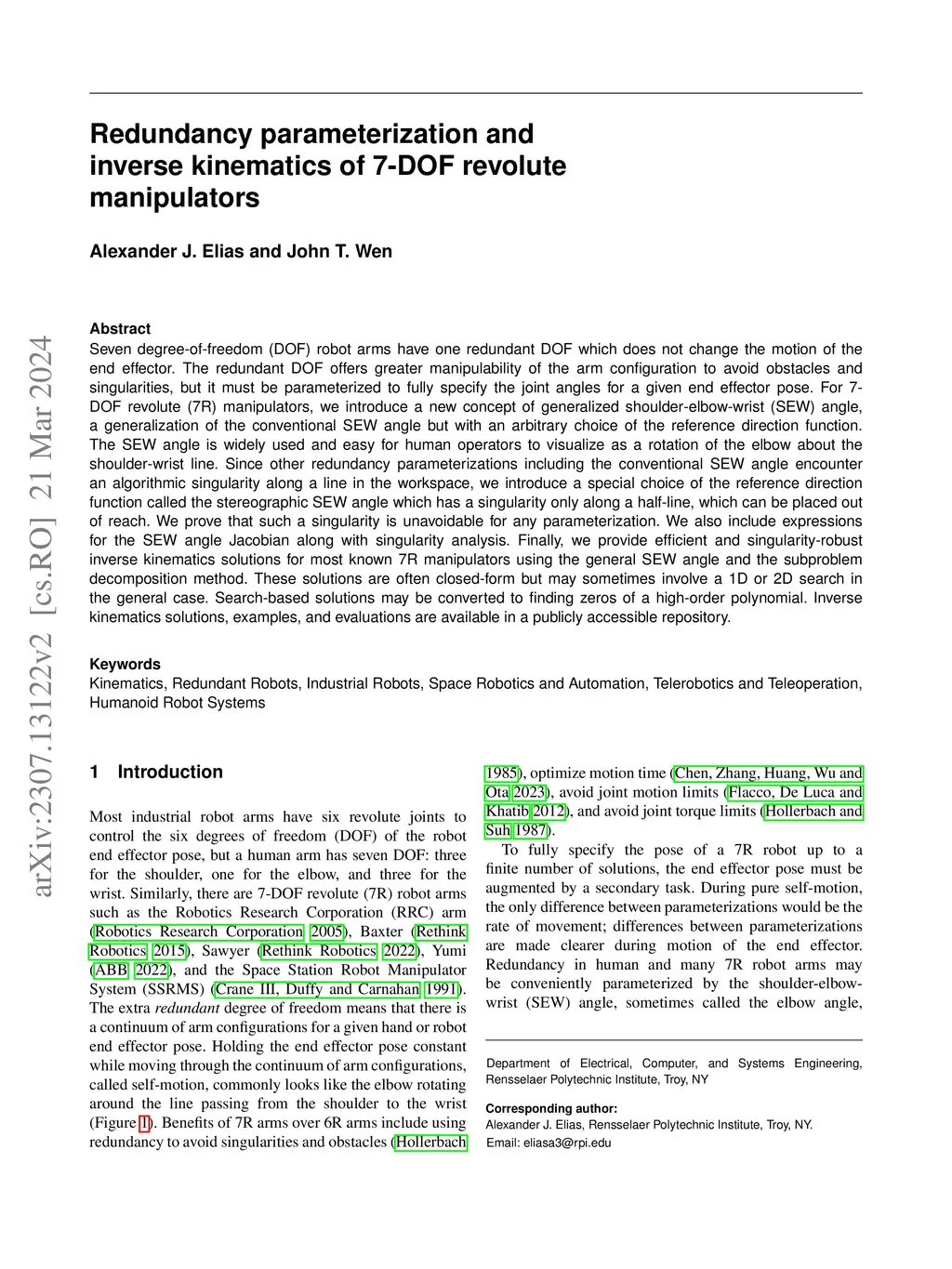 Redundancy parameterization and inverse kinematics of 7-DOF revolute