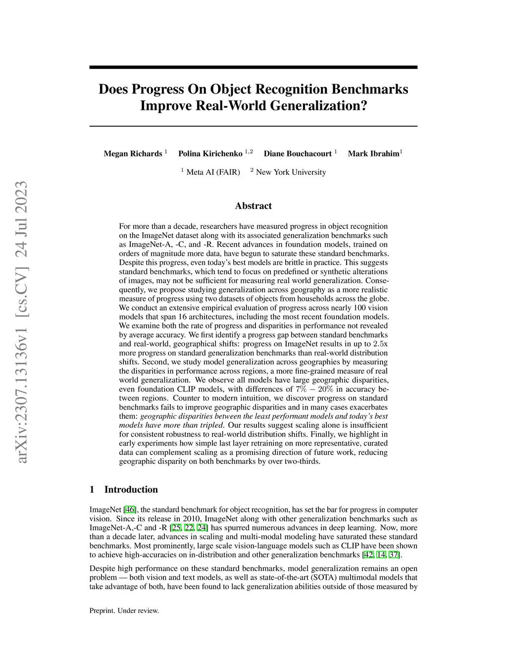 For more than a decade, researchers have measured progress in object recognition on ImageNet-based generalization benchmarks such as ImageNet-A, -C, and -R. Recent advances in foundation models, trained on orders of magnitude more data, have begun to saturate these standard benchmarks, but remain brittle in practice. This suggests standard benchmarks, which tend to focus on predefined or synthetic changes, may not be sufficient for measuring real world generalization. Consequently, we propose studying generalization across geography as a more realistic measure of progress using two datasets of objects from households across the globe. We conduct an extensive empirical evaluation of progress across nearly 100 vision models up to most recent foundation models. We first identify a progress gap between standard benchmarks and real-world, geographical shifts: progress on ImageNet results in up to 2.5x more progress on standard generalization benchmarks than real-world distribution shifts. Second, we study model generalization across geographies by measuring the disparities in performance across regions, a more fine-grained measure of real world generalization. We observe all models have large geographic disparities, even foundation CLIP models, with differences of 7-20% in accuracy between regions. Counter to modern intuition, we discover progress on standard benchmarks fails to improve geographic disparities and often exacerbates them: geographic disparities between the least performant models and today's best models have more than tripled. Our results suggest scaling alone is insufficient for consistent robustness to real-world distribution shifts. Finally, we highlight in early experiments how simple last layer retraining on more representative, curated data can complement scaling as a promising direction of future work, reducing geographic disparity on both benchmarks by over two-thirds.