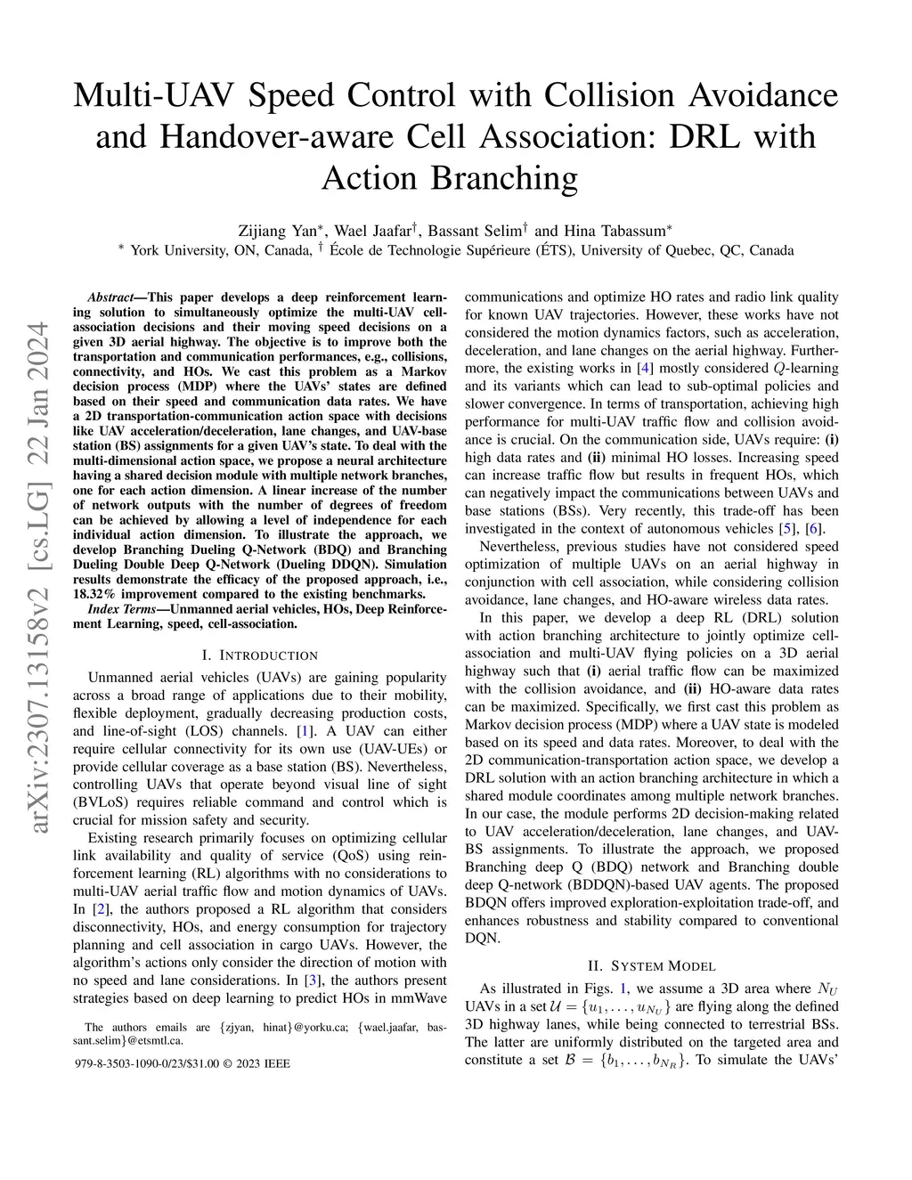 This paper presents a deep reinforcement learning solution for optimizing multi-UAV cell-association decisions and their moving velocity on a 3D aerial highway. The objective is to enhance transportation and communication performance, including collision avoidance, connectivity, and handovers. The problem is formulated as a Markov decision process (MDP) with UAVs' states defined by velocities and communication data rates. We propose a neural architecture with a shared decision module and multiple network branches, each dedicated to a specific action dimension in a 2D transportation-communication space. This design efficiently handles the multi-dimensional action space, allowing independence for individual action dimensions. We introduce two models, Branching Dueling Q-Network (BDQ) and Branching Dueling Double Deep Q-Network (Dueling DDQN), to demonstrate the approach. Simulation results show a significant improvement of 18.32% compared to existing benchmarks.