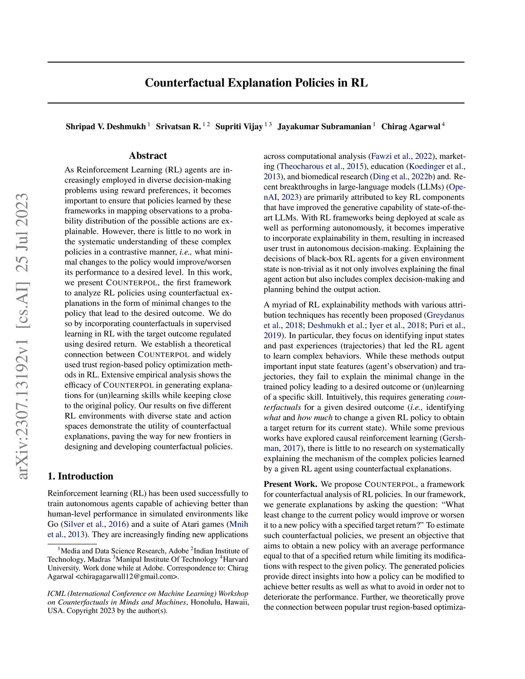 Counterfactual Explanation Policies in RL