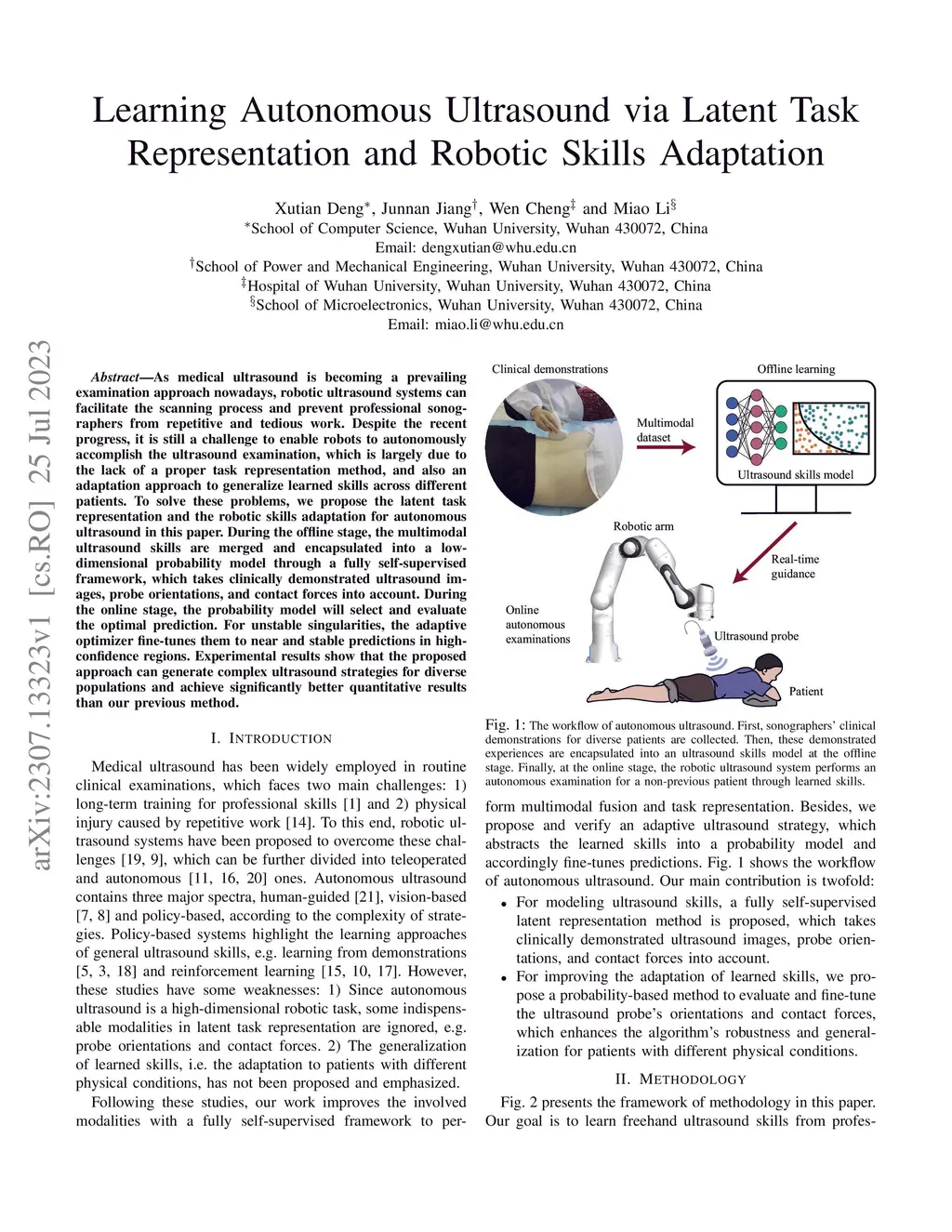As medical ultrasound is becoming a prevailing examination approach nowadays, robotic ultrasound systems can facilitate the scanning process and prevent professional sonographers from repetitive and tedious work. Despite the recent progress, it is still a challenge to enable robots to autonomously accomplish the ultrasound examination, which is largely due to the lack of a proper task representation method, and also an adaptation approach to generalize learned skills across different patients. To solve these problems, we propose the latent task representation and the robotic skills adaptation for autonomous ultrasound in this paper. During the offline stage, the multimodal ultrasound skills are merged and encapsulated into a low-dimensional probability model through a fully self-supervised framework, which takes clinically demonstrated ultrasound images, probe orientations, and contact forces into account. During the online stage, the probability model will select and evaluate the optimal prediction. For unstable singularities, the adaptive optimizer fine-tunes them to near and stable predictions in high-confidence regions. Experimental results show that the proposed approach can generate complex ultrasound strategies for diverse populations and achieve significantly better quantitative results than our previous method.