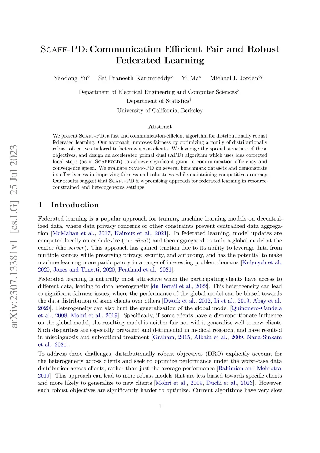 We present Scaff-PD, a fast and communication-efficient algorithm for distributionally robust federated learning. Our approach improves fairness by optimizing a family of distributionally robust objectives tailored to heterogeneous clients. We leverage the special structure of these objectives, and design an accelerated primal dual (APD) algorithm which uses bias corrected local steps (as in Scaffold) to achieve significant gains in communication efficiency and convergence speed. We evaluate Scaff-PD on several benchmark datasets and demonstrate its effectiveness in improving fairness and robustness while maintaining competitive accuracy. Our results suggest that Scaff-PD is a promising approach for federated learning in resource-constrained and heterogeneous settings.