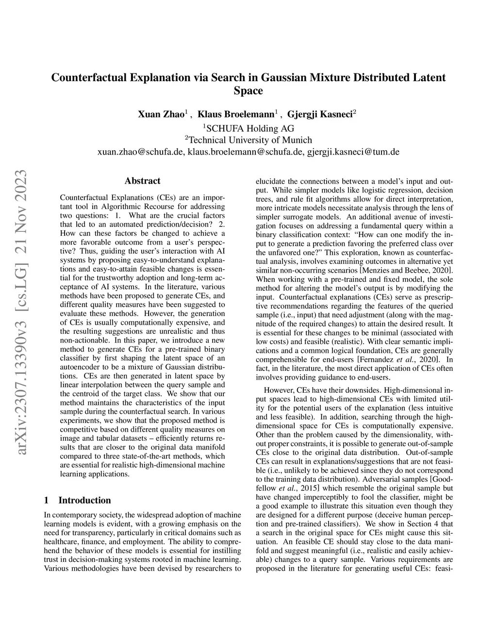 Counterfactual Explanations (CEs) are an important tool in Algorithmic Recourse for addressing two questions: 1. What are the crucial factors that led to an automated prediction/decision? 2. How can these factors be changed to achieve a more favorable outcome from a user's perspective? Thus, guiding the user's interaction with AI systems by proposing easy-to-understand explanations and easy-to-attain feasible changes is essential for the trustworthy adoption and long-term acceptance of AI systems. In the literature, various methods have been proposed to generate CEs, and different quality measures have been suggested to evaluate these methods. However, the generation of CEs is usually computationally expensive, and the resulting suggestions are unrealistic and thus non-actionable. In this paper, we introduce a new method to generate CEs for a pre-trained binary classifier by first shaping the latent space of an autoencoder to be a mixture of Gaussian distributions. CEs are then generated in latent space by linear interpolation between the query sample and the centroid of the target class. We show that our method maintains the characteristics of the input sample during the counterfactual search. In various experiments, we show that the proposed method is competitive based on different quality measures on image and tabular datasets -- efficiently returns results that are closer to the original data manifold compared to three state-of-the-art methods, which are essential for realistic high-dimensional machine learning applications.