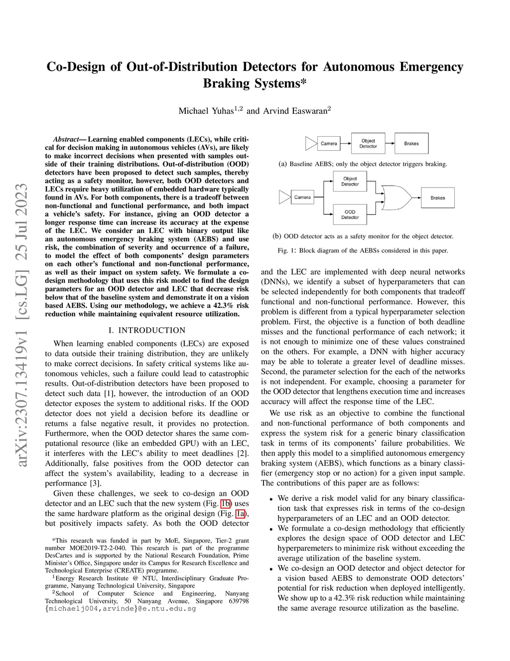 Learning enabled components (LECs), while critical for decision making in autonomous vehicles (AVs), are likely to make incorrect decisions when presented with samples outside of their training distributions. Out-of-distribution (OOD) detectors have been proposed to detect such samples, thereby acting as a safety monitor, however, both OOD detectors and LECs require heavy utilization of embedded hardware typically found in AVs. For both components, there is a tradeoff between non-functional and functional performance, and both impact a vehicle's safety. For instance, giving an OOD detector a longer response time can increase its accuracy at the expense of the LEC. We consider an LEC with binary output like an autonomous emergency braking system (AEBS) and use risk, the combination of severity and occurrence of a failure, to model the effect of both components' design parameters on each other's functional and non-functional performance, as well as their impact on system safety. We formulate a co-design methodology that uses this risk model to find the design parameters for an OOD detector and LEC that decrease risk below that of the baseline system and demonstrate it on a vision based AEBS. Using our methodology, we achieve a 42.3% risk reduction while maintaining equivalent resource utilization.