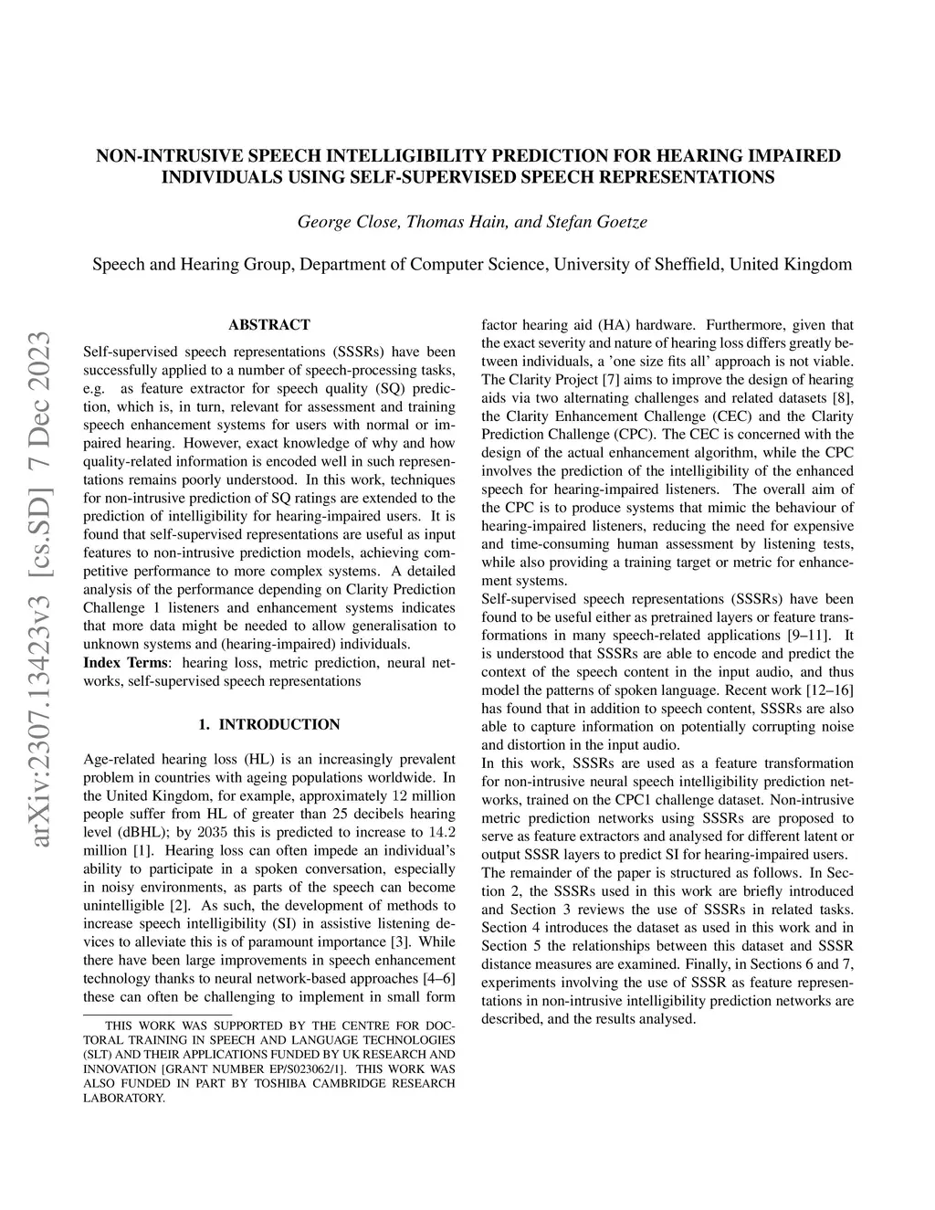 Self-supervised speech representations (SSSRs) have been successfully applied to a number of speech-processing tasks, e.g. as feature extractor for speech quality (SQ) prediction, which is, in turn, relevant for assessment and training speech enhancement systems for users with normal or impaired hearing. However, exact knowledge of why and how quality-related information is encoded well in such representations remains poorly understood. In this work, techniques for non-intrusive prediction of SQ ratings are extended to the prediction of intelligibility for hearing-impaired users. It is found that self-supervised representations are useful as input features to non-intrusive prediction models, achieving competitive performance to more complex systems. A detailed analysis of the performance depending on Clarity Prediction Challenge 1 listeners and enhancement systems indicates that more data might be needed to allow generalisation to unknown systems and (hearing-impaired) individuals