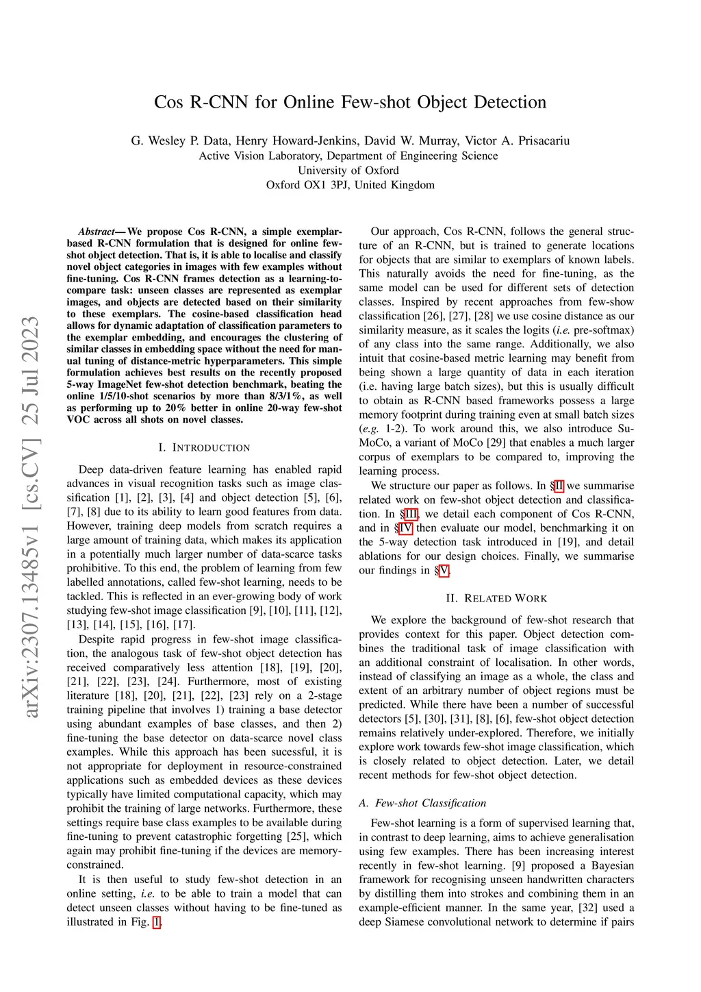 Cos R-CNN for Online Few-shot Object Detection