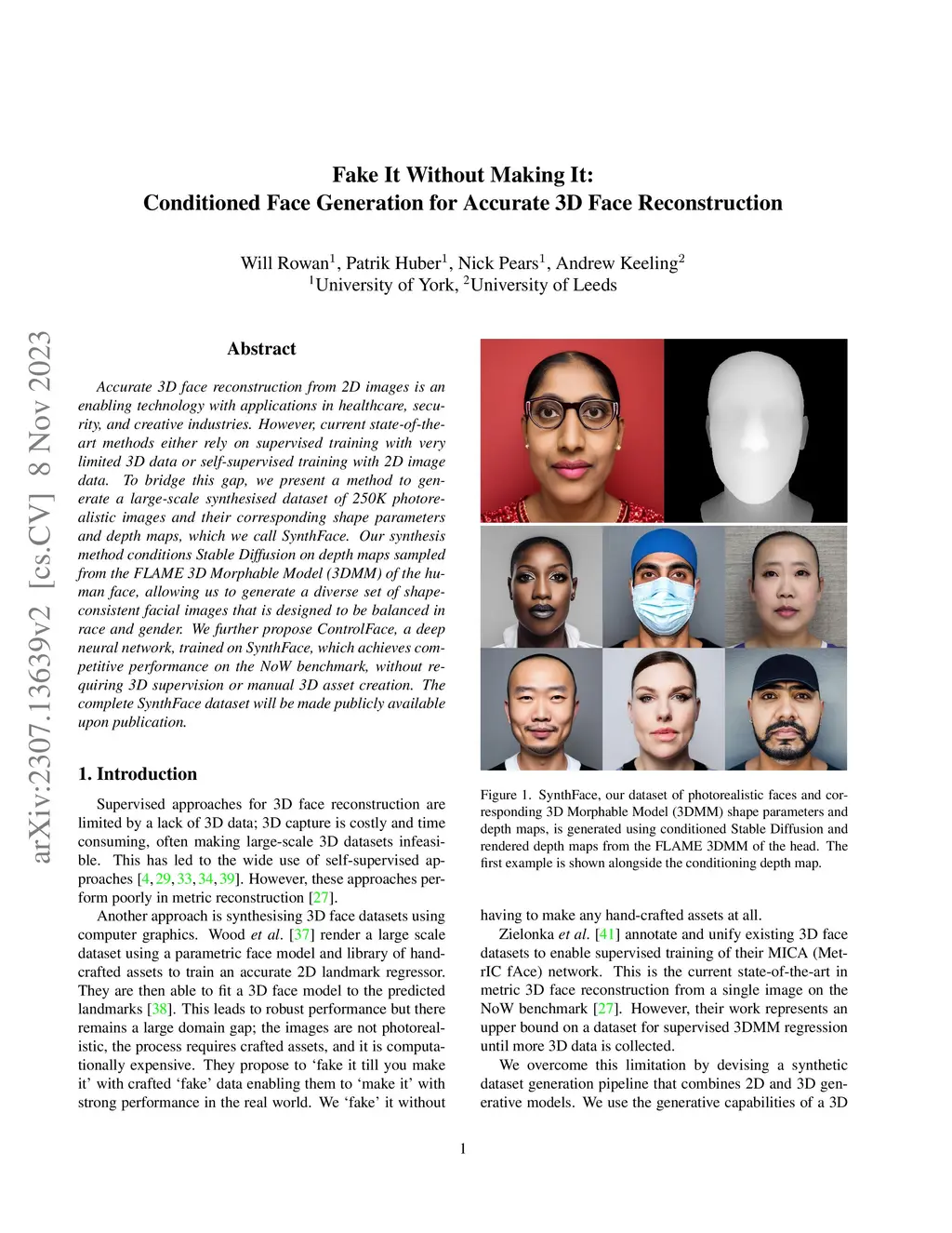 Accurate 3D face reconstruction from 2D images is an enabling technology with applications in healthcare, security, and creative industries. However, current state-of-the-art methods either rely on supervised training with very limited 3D data or self-supervised training with 2D image data. To bridge this gap, we present a method to generate a large-scale synthesised dataset of 250K photorealistic images and their corresponding shape parameters and depth maps, which we call SynthFace. Our synthesis method conditions Stable Diffusion on depth maps sampled from the FLAME 3D Morphable Model (3DMM) of the human face, allowing us to generate a diverse set of shape-consistent facial images that is designed to be balanced in race and gender. We further propose ControlFace, a deep neural network, trained on SynthFace, which achieves competitive performance on the NoW benchmark, without requiring 3D supervision or manual 3D asset creation. The complete SynthFace dataset will be made publicly available upon publication.