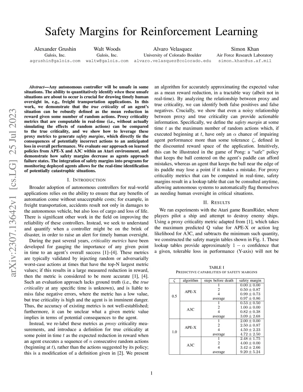 Any autonomous controller will be unsafe in some situations. The ability to quantitatively identify when these unsafe situations are about to occur is crucial for drawing timely human oversight in, e.g., freight transportation applications. In this work, we demonstrate that the true criticality of an agent's situation can be robustly defined as the mean reduction in reward given some number of random actions. Proxy criticality metrics that are computable in real-time (i.e., without actually simulating the effects of random actions) can be compared to the true criticality, and we show how to leverage these proxy metrics to generate safety margins, which directly tie the consequences of potentially incorrect actions to an anticipated loss in overall performance. We evaluate our approach on learned policies from APE-X and A3C within an Atari environment, and demonstrate how safety margins decrease as agents approach failure states. The integration of safety margins into programs for monitoring deployed agents allows for the real-time identification of potentially catastrophic situations.