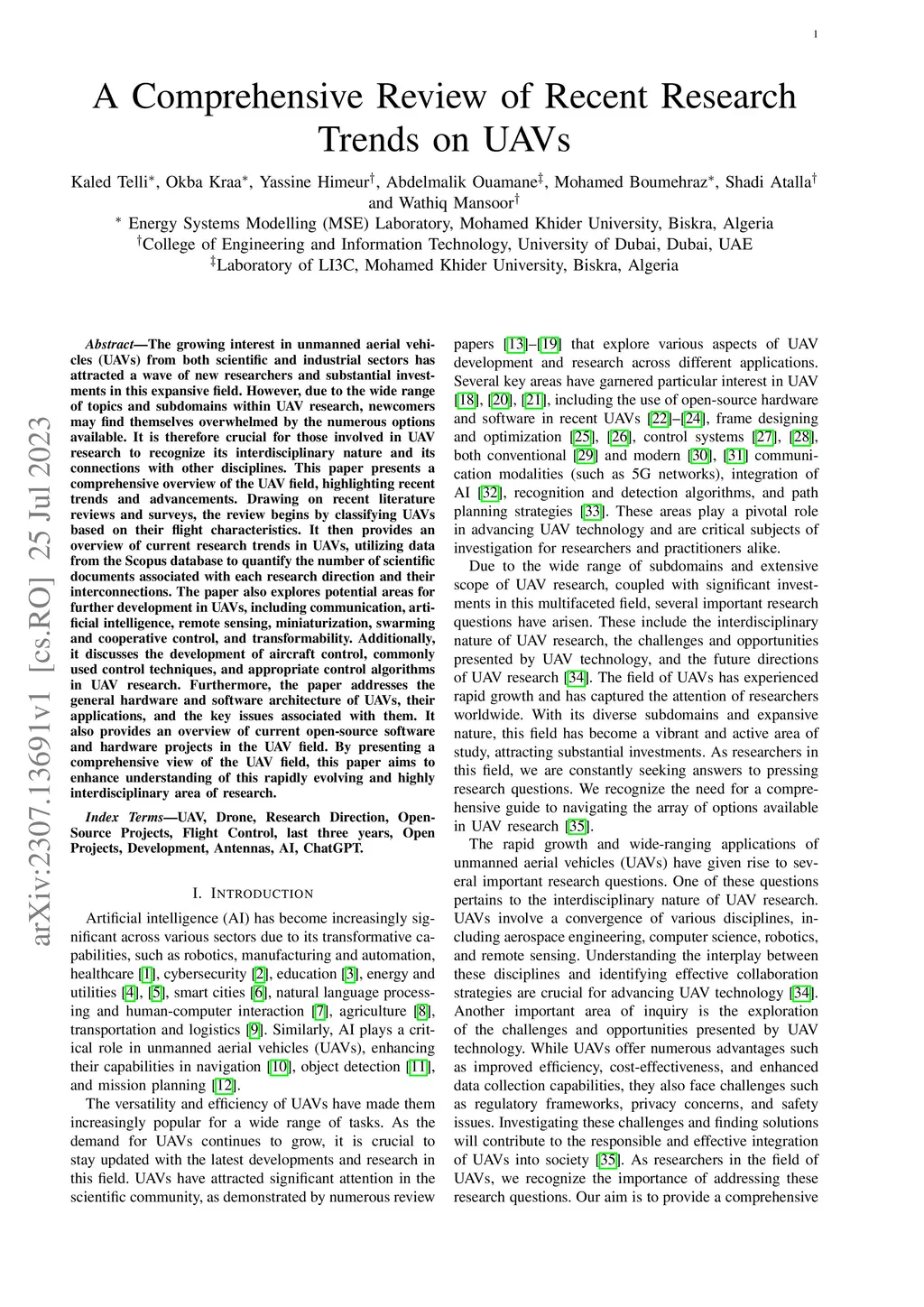 The growing interest in unmanned aerial vehicles (UAVs) from both scientific and industrial sectors has attracted a wave of new researchers and substantial investments in this expansive field. However, due to the wide range of topics and subdomains within UAV research, newcomers may find themselves overwhelmed by the numerous options available. It is therefore crucial for those involved in UAV research to recognize its interdisciplinary nature and its connections with other disciplines. This paper presents a comprehensive overview of the UAV field, highlighting recent trends and advancements. Drawing on recent literature reviews and surveys, the review begins by classifying UAVs based on their flight characteristics. It then provides an overview of current research trends in UAVs, utilizing data from the Scopus database to quantify the number of scientific documents associated with each research direction and their interconnections. The paper also explores potential areas for further development in UAVs, including communication, artificial intelligence, remote sensing, miniaturization, swarming and cooperative control, and transformability. Additionally, it discusses the development of aircraft control, commonly used control techniques, and appropriate control algorithms in UAV research. Furthermore, the paper addresses the general hardware and software architecture of UAVs, their applications, and the key issues associated with them. It also provides an overview of current open-source software and hardware projects in the UAV field. By presenting a comprehensive view of the UAV field, this paper aims to enhance understanding of this rapidly evolving and highly interdisciplinary area of research.