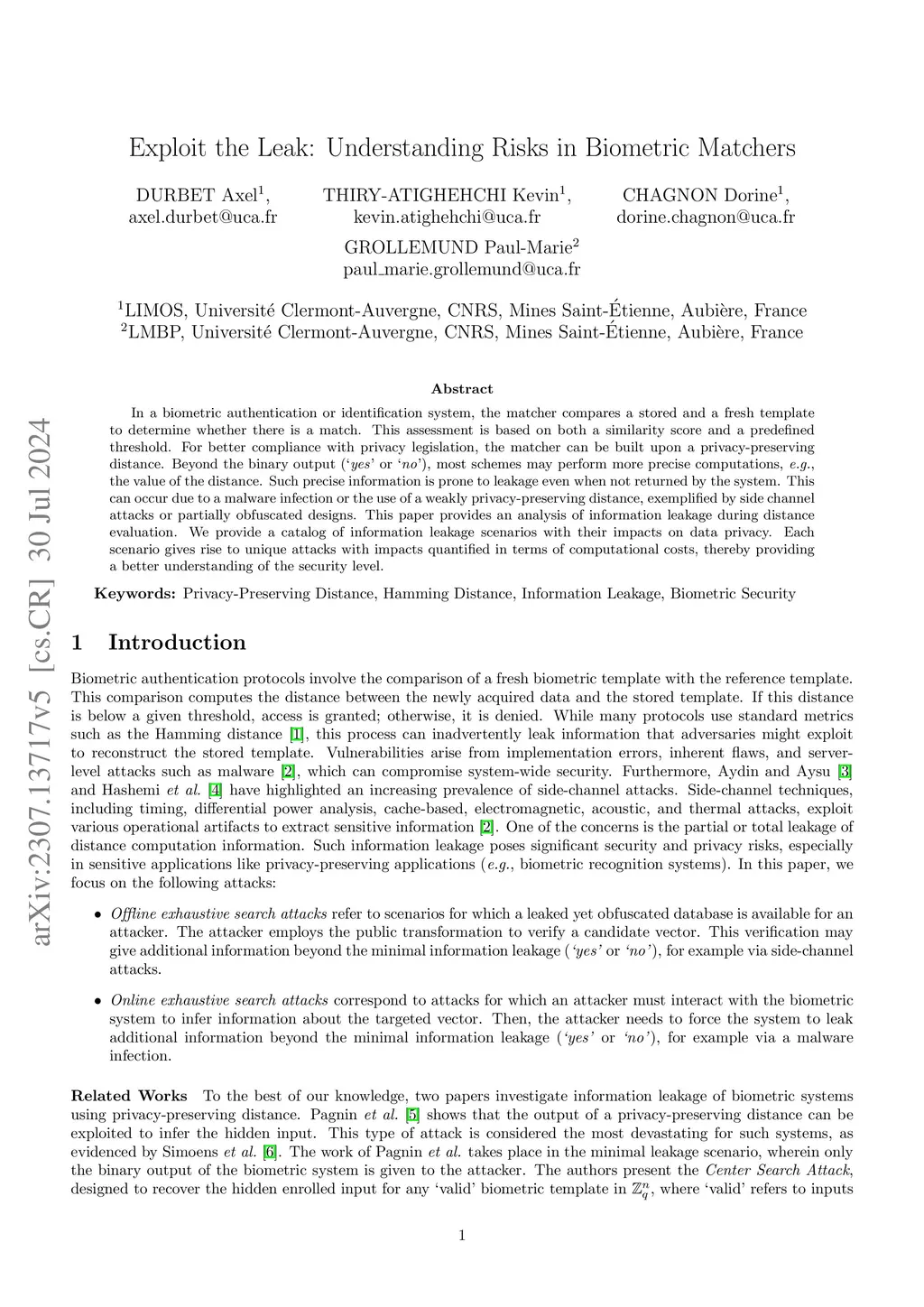 In a biometric authentication or identification system, the matcher compares a stored and a fresh template to determine whether there is a match. This assessment is based on both a similarity score and a predefined threshold. For better compliance with privacy legislation, the matcher can be built upon a threshold-based obfuscated distance (i.e., Fuzzy Matcher). Beyond the binary output ("yes" or "no"), most algorithms perform more precise computations, e.g., the value of the distance. Such precise information is prone to leakage even when not returned by the matcher. This can occur due to a malware infection or the use of a weakly privacy-preserving matcher, exemplified by side channel attacks or partially obfuscated designs. This paper provides an analysis of information leakage during distance evaluation, with an emphasis on threshold-based obfuscated distance. We provide a catalog of information leakage scenarios with their impacts on data privacy. Each scenario gives rise to unique attacks with impacts quantified in terms of computational costs, thereby providing a better understanding of the security level.