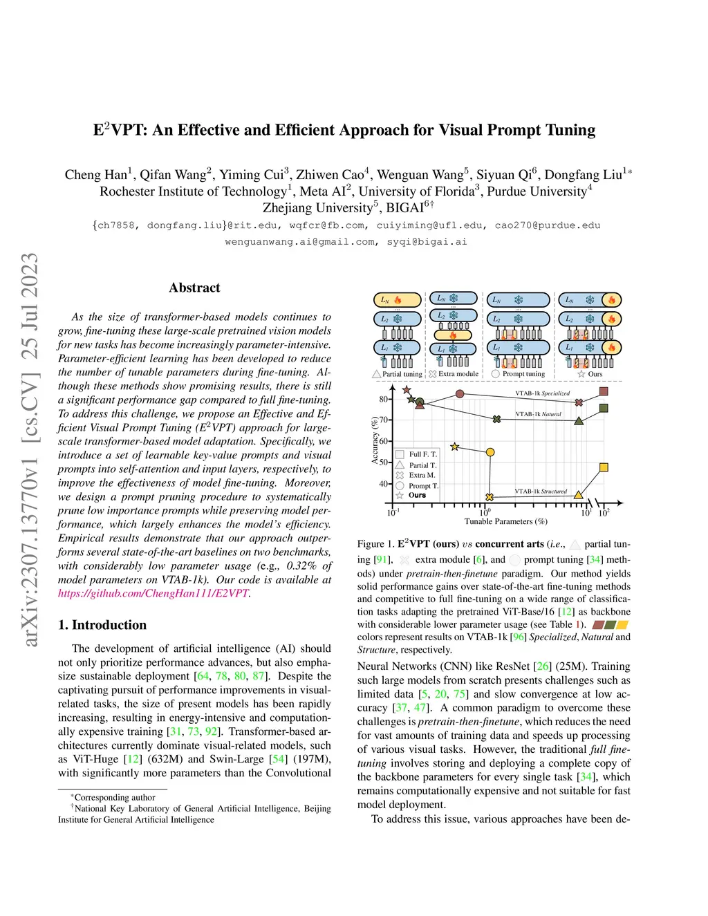 As the size of transformer-based models continues to grow, fine-tuning these large-scale pretrained vision models for new tasks has become increasingly parameter-intensive. Parameter-efficient learning has been developed to reduce the number of tunable parameters during fine-tuning. Although these methods show promising results, there is still a significant performance gap compared to full fine-tuning. To address this challenge, we propose an Effective and Efficient Visual Prompt Tuning (E^2VPT) approach for large-scale transformer-based model adaptation. Specifically, we introduce a set of learnable key-value prompts and visual prompts into self-attention and input layers, respectively, to improve the effectiveness of model fine-tuning. Moreover, we design a prompt pruning procedure to systematically prune low importance prompts while preserving model performance, which largely enhances the model's efficiency. Empirical results demonstrate that our approach outperforms several state-of-the-art baselines on two benchmarks, with considerably low parameter usage (e.g., 0.32% of model parameters on VTAB-1k). Our code is available at https://github.com/ChengHan111/E2VPT.
