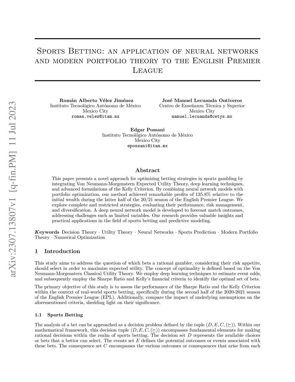 This paper presents a novel approach for optimizing betting strategies in sports gambling by integrating Von Neumann-Morgenstern Expected Utility Theory, deep learning techniques, and advanced formulations of the Kelly Criterion. By combining neural network models with portfolio optimization, our method achieved remarkable profits of 135.8% relative to the initial wealth during the latter half of the 20/21 season of the English Premier League. We explore complete and restricted strategies, evaluating their performance, risk management, and diversification. A deep neural network model is developed to forecast match outcomes, addressing challenges such as limited variables. Our research provides valuable insights and practical applications in the field of sports betting and predictive modeling.