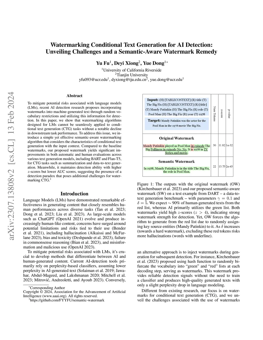 Watermarking Conditional Text Generation for AI Detection: Unveiling