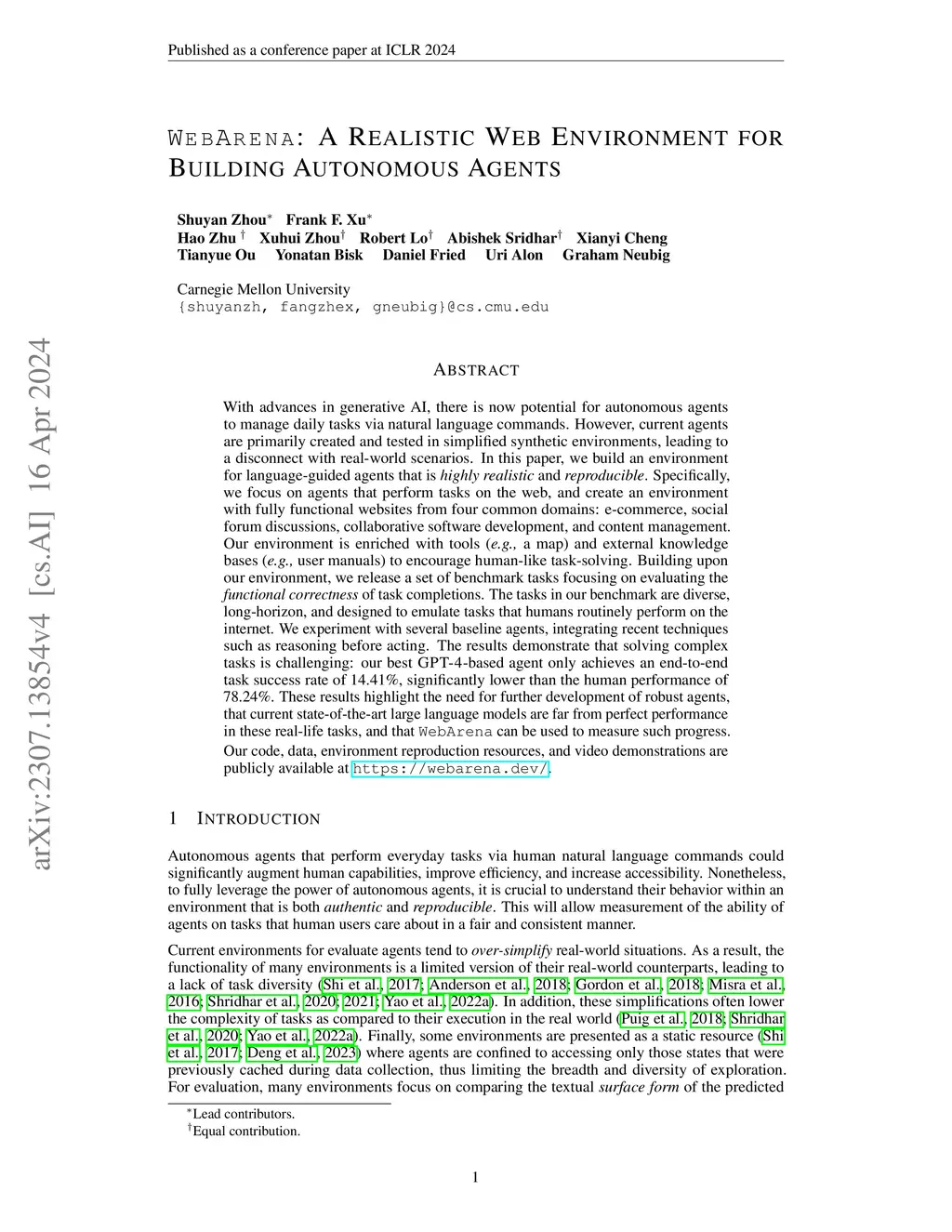 With advances in generative AI, there is now potential for autonomous agents to manage daily tasks via natural language commands. However, current agents are primarily created and tested in simplified synthetic environments, leading to a disconnect with real-world scenarios. In this paper, we build an environment for language-guided agents that is highly realistic and reproducible. Specifically, we focus on agents that perform tasks on the web, and create an environment with fully functional websites from four common domains: e-commerce, social forum discussions, collaborative software development, and content management. Our environment is enriched with tools (e.g., a map) and external knowledge bases (e.g., user manuals) to encourage human-like task-solving. Building upon our environment, we release a set of benchmark tasks focusing on evaluating the functional correctness of task completions. The tasks in our benchmark are diverse, long-horizon, and designed to emulate tasks that humans routinely perform on the internet. We experiment with several baseline agents, integrating recent techniques such as reasoning before acting. The results demonstrate that solving complex tasks is challenging: our best GPT-4-based agent only achieves an end-to-end task success rate of 14.41%, significantly lower than the human performance of 78.24%. These results highlight the need for further development of robust agents, that current state-of-the-art large language models are far from perfect performance in these real-life tasks, and that WebArena can be used to measure such progress.