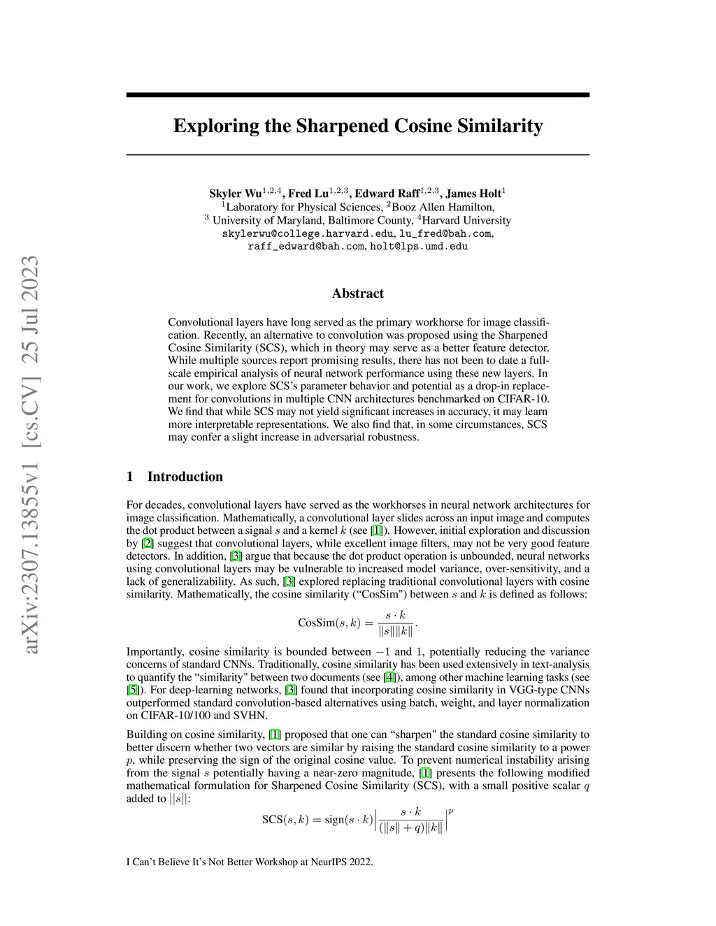 Convolutional layers have long served as the primary workhorse for image classification. Recently, an alternative to convolution was proposed using the Sharpened Cosine Similarity (SCS), which in theory may serve as a better feature detector. While multiple sources report promising results, there has not been to date a full-scale empirical analysis of neural network performance using these new layers. In our work, we explore SCS's parameter behavior and potential as a drop-in replacement for convolutions in multiple CNN architectures benchmarked on CIFAR-10. We find that while SCS may not yield significant increases in accuracy, it may learn more interpretable representations. We also find that, in some circumstances, SCS may confer a slight increase in adversarial robustness.