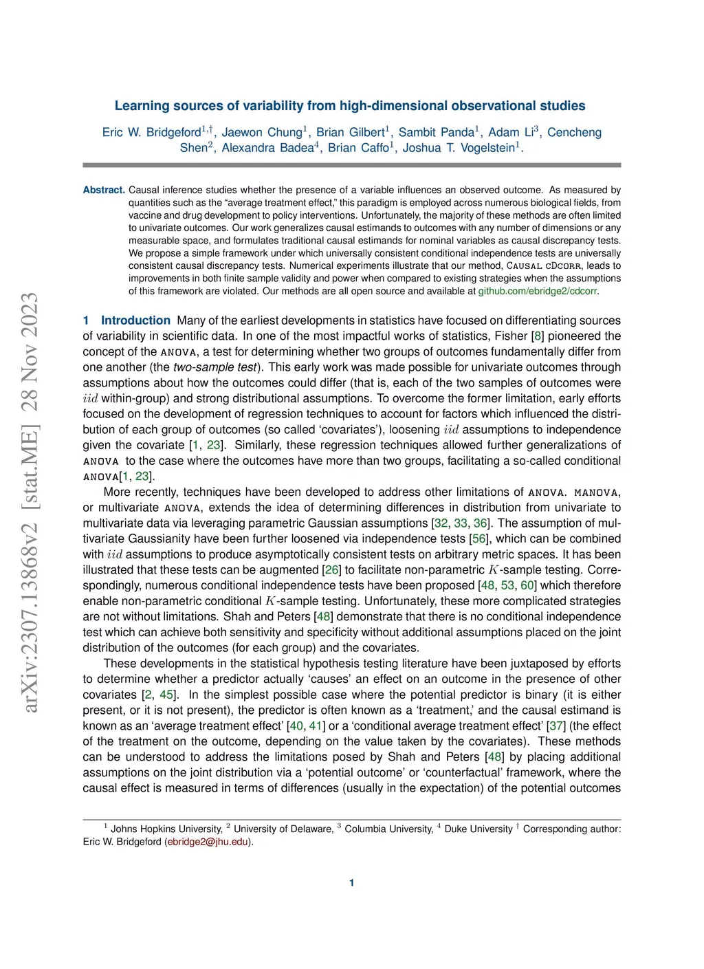 Causal inference studies whether the presence of a variable influences an observed outcome. As measured by quantities such as the "average treatment effect," this paradigm is employed across numerous biological fields, from vaccine and drug development to policy interventions. Unfortunately, the majority of these methods are often limited to univariate outcomes. Our work generalizes causal estimands to outcomes with any number of dimensions or any measurable space, and formulates traditional causal estimands for nominal variables as causal discrepancy tests. We propose a simple technique for adjusting universally consistent conditional independence tests and prove that these tests are universally consistent causal discrepancy tests. Numerical experiments illustrate that our method, Causal CDcorr, leads to improvements in both finite sample validity and power when compared to existing strategies. Our methods are all open source and available at github.com/ebridge2/cdcorr.