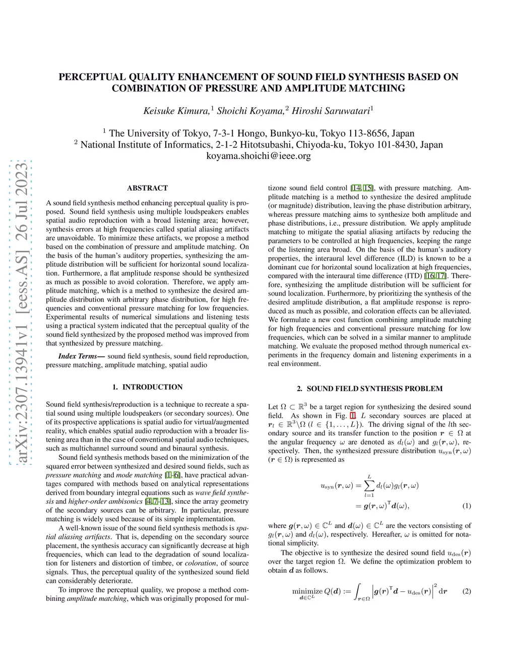 A sound field synthesis method enhancing perceptual quality is proposed. Sound field synthesis using multiple loudspeakers enables spatial audio reproduction with a broad listening area; however, synthesis errors at high frequencies called spatial aliasing artifacts are unavoidable. To minimize these artifacts, we propose a method based on the combination of pressure and amplitude matching. On the basis of the human's auditory properties, synthesizing the amplitude distribution will be sufficient for horizontal sound localization. Furthermore, a flat amplitude response should be synthesized as much as possible to avoid coloration. Therefore, we apply amplitude matching, which is a method to synthesize the desired amplitude distribution with arbitrary phase distribution, for high frequencies and conventional pressure matching for low frequencies. Experimental results of numerical simulations and listening tests using a practical system indicated that the perceptual quality of the sound field synthesized by the proposed method was improved from that synthesized by pressure matching.