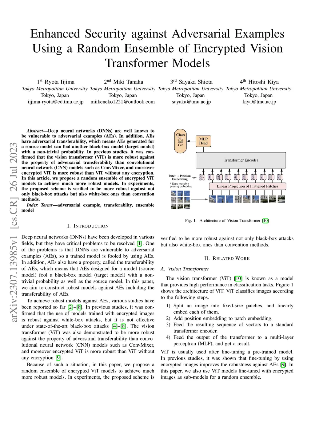 Deep neural networks (DNNs) are well known to be vulnerable to adversarial examples (AEs). In addition, AEs have adversarial transferability, which means AEs generated for a source model can fool another black-box model (target model) with a non-trivial probability. In previous studies, it was confirmed that the vision transformer (ViT) is more robust against the property of adversarial transferability than convolutional neural network (CNN) models such as ConvMixer, and moreover encrypted ViT is more robust than ViT without any encryption. In this article, we propose a random ensemble of encrypted ViT models to achieve much more robust models. In experiments, the proposed scheme is verified to be more robust against not only black-box attacks but also white-box ones than convention methods.