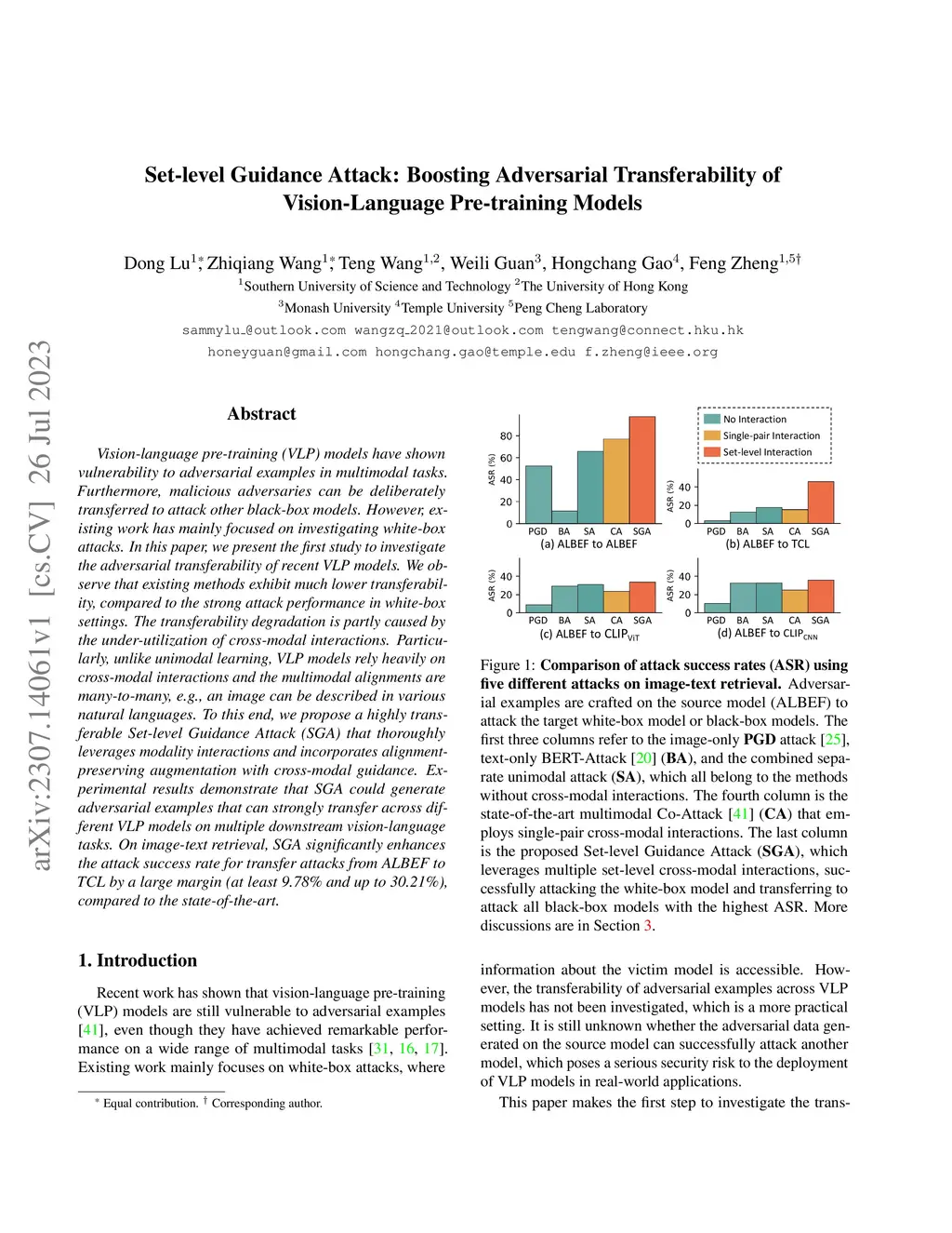 Vision-language pre-training (VLP) models have shown vulnerability to adversarial examples in multimodal tasks. Furthermore, malicious adversaries can be deliberately transferred to attack other black-box models. However, existing work has mainly focused on investigating white-box attacks. In this paper, we present the first study to investigate the adversarial transferability of recent VLP models. We observe that existing methods exhibit much lower transferability, compared to the strong attack performance in white-box settings. The transferability degradation is partly caused by the under-utilization of cross-modal interactions. Particularly, unlike unimodal learning, VLP models rely heavily on cross-modal interactions and the multimodal alignments are many-to-many, e.g., an image can be described in various natural languages. To this end, we propose a highly transferable Set-level Guidance Attack (SGA) that thoroughly leverages modality interactions and incorporates alignment-preserving augmentation with cross-modal guidance. Experimental results demonstrate that SGA could generate adversarial examples that can strongly transfer across different VLP models on multiple downstream vision-language tasks. On image-text retrieval, SGA significantly enhances the attack success rate for transfer attacks from ALBEF to TCL by a large margin (at least 9.78% and up to 30.21%), compared to the state-of-the-art.