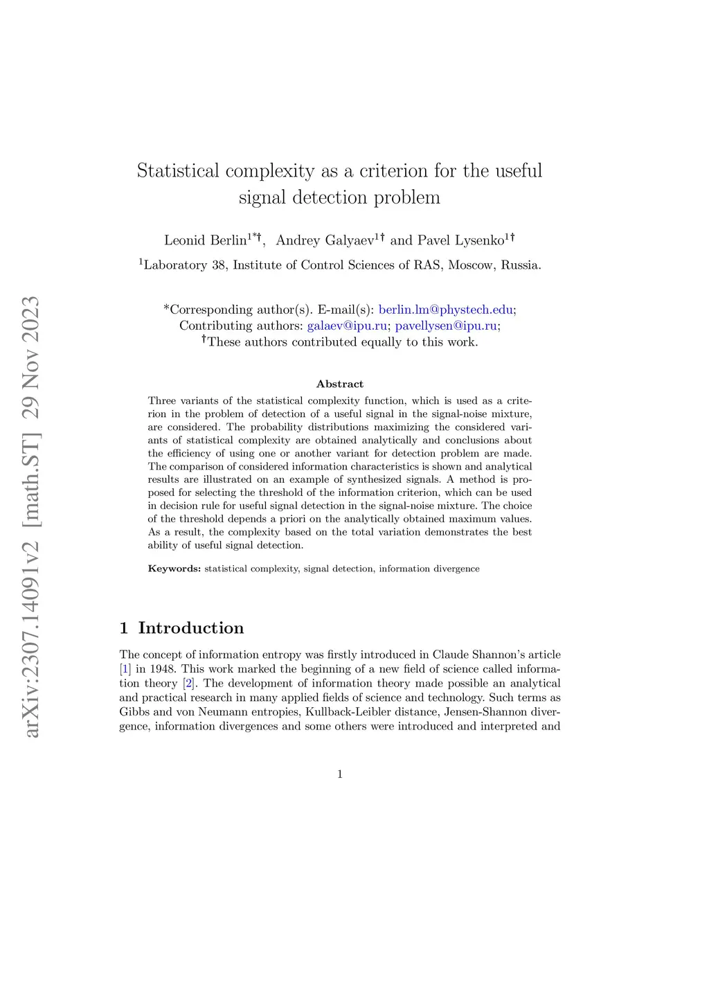 Three variants of the statistical complexity function, which is used as a criterion in the problem of detection of a useful signal in the signal-noise mixture, are considered. The probability distributions maximizing the considered variants of statistical complexity are obtained analytically and conclusions about the efficiency of using one or another variant for detection problem are made. The comparison of considered information characteristics is shown and analytical results are illustrated on an example of synthesized signals. A method is proposed for selecting the threshold of the information criterion, which can be used in decision rule for useful signal detection in the signal-noise mixture. The choice of the threshold depends a priori on the analytically obtained maximum values. As a result, the complexity based on the total variation demonstrates the best ability of useful signal detection.