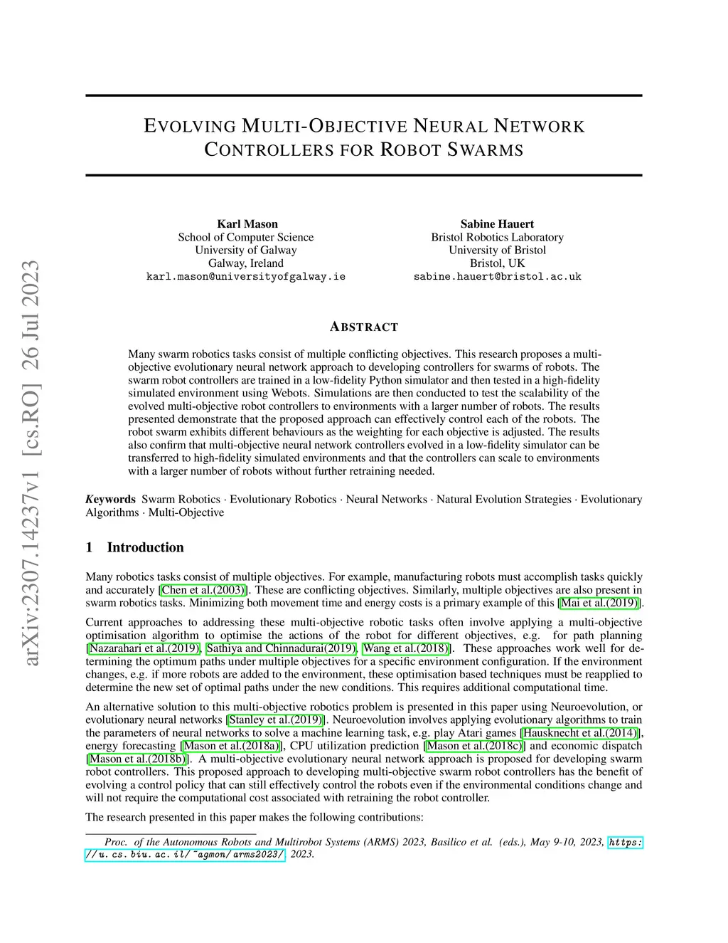 Evolving Multi-Objective Neural Network Controllers for Robot Swarms