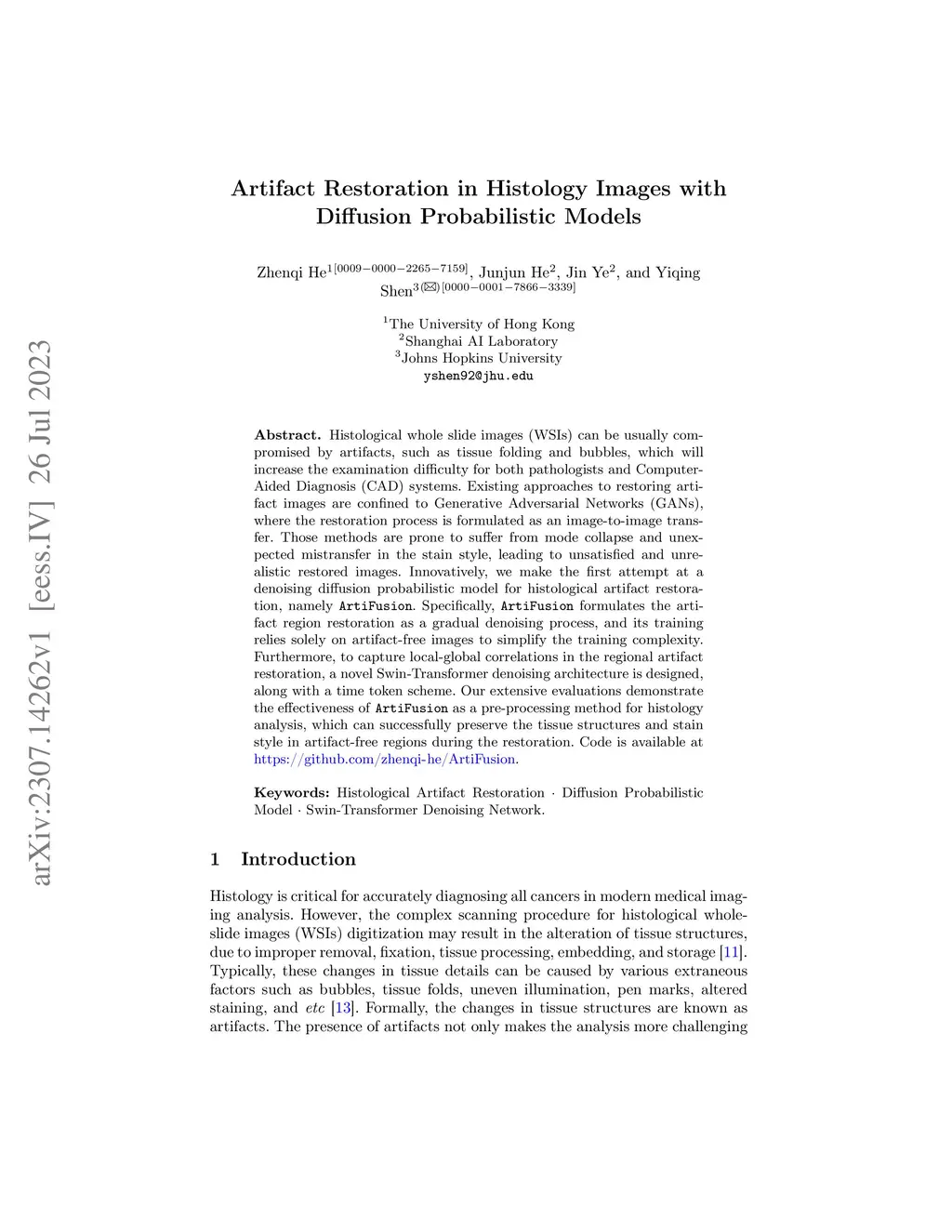 Histological whole slide images (WSIs) can be usually compromised by artifacts, such as tissue folding and bubbles, which will increase the examination difficulty for both pathologists and Computer-Aided Diagnosis (CAD) systems. Existing approaches to restoring artifact images are confined to Generative Adversarial Networks (GANs), where the restoration process is formulated as an image-to-image transfer. Those methods are prone to suffer from mode collapse and unexpected mistransfer in the stain style, leading to unsatisfied and unrealistic restored images. Innovatively, we make the first attempt at a denoising diffusion probabilistic model for histological artifact restoration, namely ArtiFusion.Specifically, ArtiFusion formulates the artifact region restoration as a gradual denoising process, and its training relies solely on artifact-free images to simplify the training complexity.Furthermore, to capture local-global correlations in the regional artifact restoration, a novel Swin-Transformer denoising architecture is designed, along with a time token scheme. Our extensive evaluations demonstrate the effectiveness of ArtiFusion as a pre-processing method for histology analysis, which can successfully preserve the tissue structures and stain style in artifact-free regions during the restoration. Code is available at https://github.com/zhenqi-he/ArtiFusion.