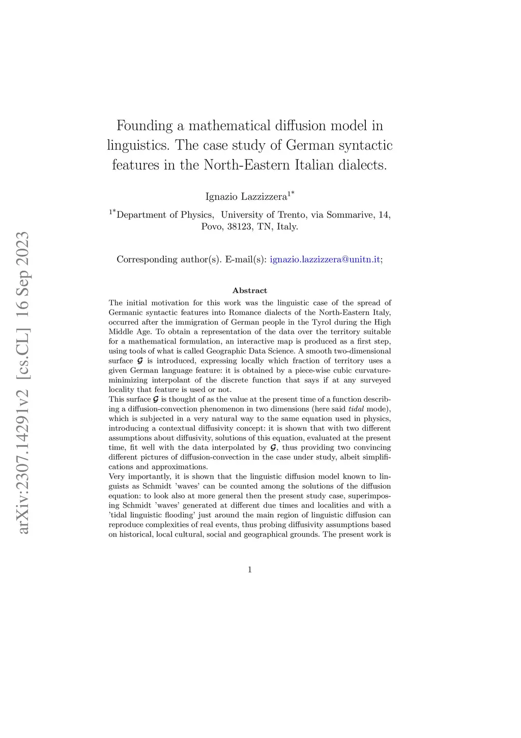 The initial motivation for this work was the linguistic case of the spread of Germanic syntactic features into Romance dialects of North-Eastern Italy, which occurred after the immigration of German people to Tyrol during the High Middle Ages. To obtain a representation of the data over the territory suitable for a mathematical formulation, an interactive map is produced as a first step, using tools of what is called Geographic Data Science. A smooth two-dimensional surface G is introduced, expressing locally which fraction of territory uses a given German language feature: it is obtained by a piecewise cubic curvature minimizing interpolant of the discrete function that says if at any surveyed locality that feature is used or not. This surface G is thought of as the value at the present time of a function describing a diffusion-convection phenomenon in two dimensions (here said tidal mode), which is subjected in a very natural way to the same equation used in physics, introducing a contextual diffusivity concept: it is shown that with two different assumptions about diffusivity, solutions of this equation, evaluated at the present time, fit well with the data interpolated by G, thus providing two convincing different pictures of diffusion-convection in the case under study, albeit simplifications and approximations. Very importantly, it is shown that the linguistic diffusion model known to linguists as Schmidt waves can be counted among the solutions of the diffusion equation