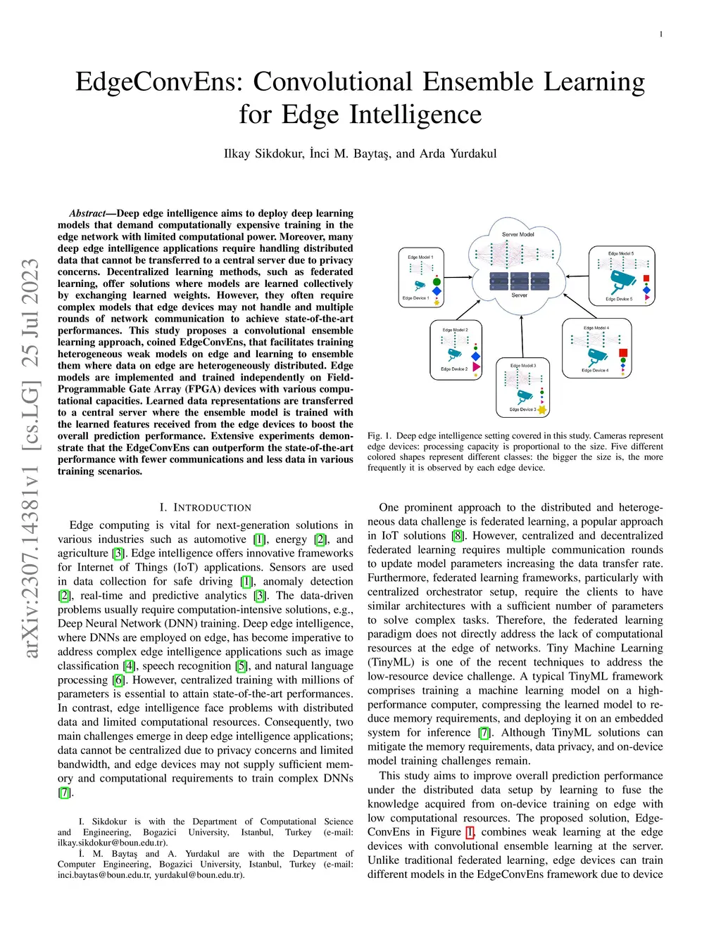 Deep edge intelligence aims to deploy deep learning models that demand computationally expensive training in the edge network with limited computational power. Moreover, many deep edge intelligence applications require handling distributed data that cannot be transferred to a central server due to privacy concerns. Decentralized learning methods, such as federated learning, offer solutions where models are learned collectively by exchanging learned weights. However, they often require complex models that edge devices may not handle and multiple rounds of network communication to achieve state-of-the-art performances. This study proposes a convolutional ensemble learning approach, coined EdgeConvEns, that facilitates training heterogeneous weak models on edge and learning to ensemble them where data on edge are heterogeneously distributed. Edge models are implemented and trained independently on Field-Programmable Gate Array (FPGA) devices with various computational capacities. Learned data representations are transferred to a central server where the ensemble model is trained with the learned features received from the edge devices to boost the overall prediction performance. Extensive experiments demonstrate that the EdgeConvEns can outperform the state-of-the-art performance with fewer communications and less data in various training scenarios.