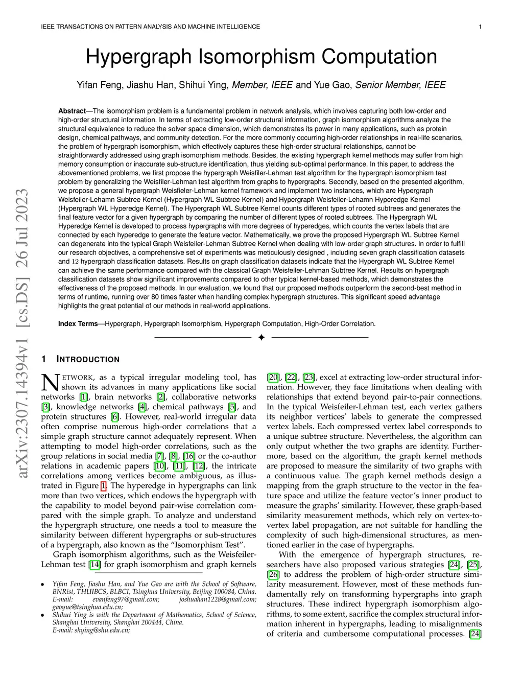 The isomorphism problem is a fundamental problem in network analysis, which involves capturing both low-order and high-order structural information. In terms of extracting low-order structural information, graph isomorphism algorithms analyze the structural equivalence to reduce the solver space dimension, which demonstrates its power in many applications, such as protein design, chemical pathways, and community detection. For the more commonly occurring high-order relationships in real-life scenarios, the problem of hypergraph isomorphism, which effectively captures these high-order structural relationships, cannot be straightforwardly addressed using graph isomorphism methods. Besides, the existing hypergraph kernel methods may suffer from high memory consumption or inaccurate sub-structure identification, thus yielding sub-optimal performance. In this paper, to address the abovementioned problems, we first propose the hypergraph Weisfiler-Lehman test algorithm for the hypergraph isomorphism test problem by generalizing the Weisfiler-Lehman test algorithm from graphs to hypergraphs. Secondly, based on the presented algorithm, we propose a general hypergraph Weisfieler-Lehman kernel framework and implement two instances, which are Hypergraph Weisfeiler-Lehamn Subtree Kernel and Hypergraph Weisfeiler-Lehamn Hyperedge Kernel. In order to fulfill our research objectives, a comprehensive set of experiments was meticulously designed, including seven graph classification datasets and 12 hypergraph classification datasets. Results on hypergraph classification datasets show significant improvements compared to other typical kernel-based methods, which demonstrates the effectiveness of the proposed methods. In our evaluation, we found that our proposed methods outperform the second-best method in terms of runtime, running over 80 times faster when handling complex hypergraph structures.