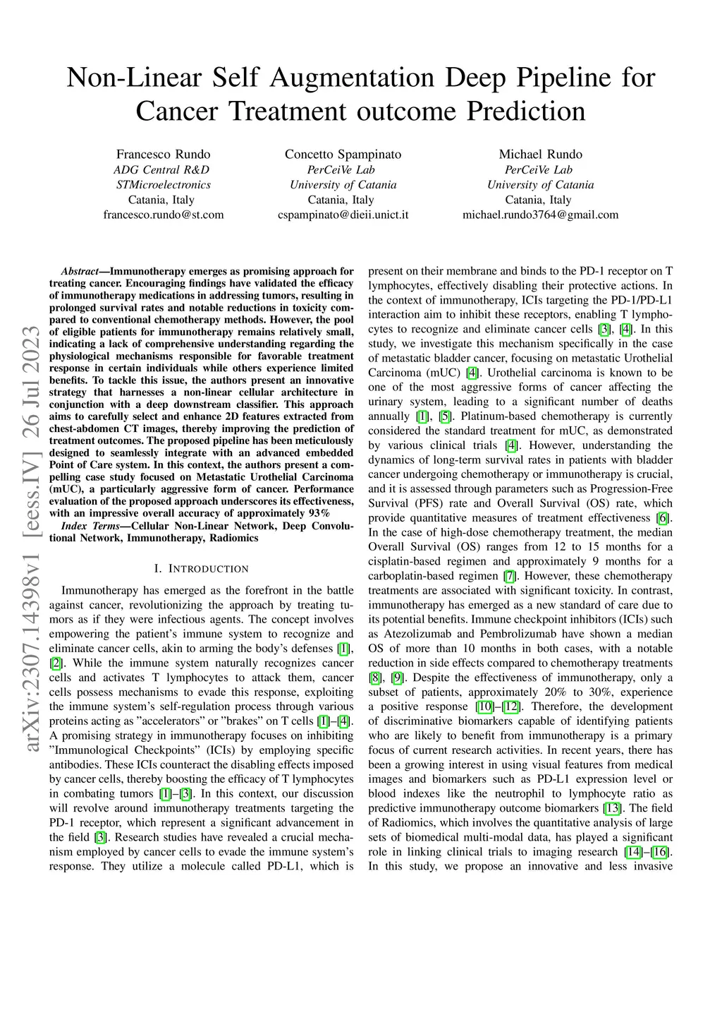 Immunotherapy emerges as promising approach for treating cancer. Encouraging findings have validated the efficacy of immunotherapy medications in addressing tumors, resulting in prolonged survival rates and notable reductions in toxicity compared to conventional chemotherapy methods. However, the pool of eligible patients for immunotherapy remains relatively small, indicating a lack of comprehensive understanding regarding the physiological mechanisms responsible for favorable treatment response in certain individuals while others experience limited benefits. To tackle this issue, the authors present an innovative strategy that harnesses a non-linear cellular architecture in conjunction with a deep downstream classifier. This approach aims to carefully select and enhance 2D features extracted from chest-abdomen CT images, thereby improving the prediction of treatment outcomes. The proposed pipeline has been meticulously designed to seamlessly integrate with an advanced embedded Point of Care system. In this context, the authors present a compelling case study focused on Metastatic Urothelial Carcinoma (mUC), a particularly aggressive form of cancer. Performance evaluation of the proposed approach underscores its effectiveness, with an impressive overall accuracy of approximately 93%