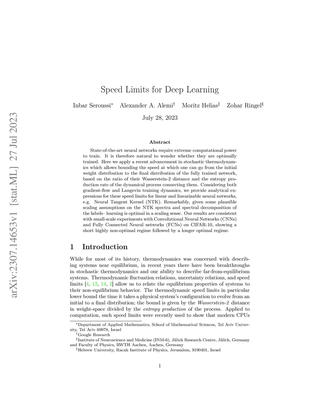 State-of-the-art neural networks require extreme computational power to train. It is therefore natural to wonder whether they are optimally trained. Here we apply a recent advancement in stochastic thermodynamics which allows bounding the speed at which one can go from the initial weight distribution to the final distribution of the fully trained network, based on the ratio of their Wasserstein-2 distance and the entropy production rate of the dynamical process connecting them. Considering both gradient-flow and Langevin training dynamics, we provide analytical expressions for these speed limits for linear and linearizable neural networks e.g. Neural Tangent Kernel (NTK). Remarkably, given some plausible scaling assumptions on the NTK spectra and spectral decomposition of the labels -- learning is optimal in a scaling sense. Our results are consistent with small-scale experiments with Convolutional Neural Networks (CNNs) and Fully Connected Neural networks (FCNs) on CIFAR-10, showing a short highly non-optimal regime followed by a longer optimal regime.