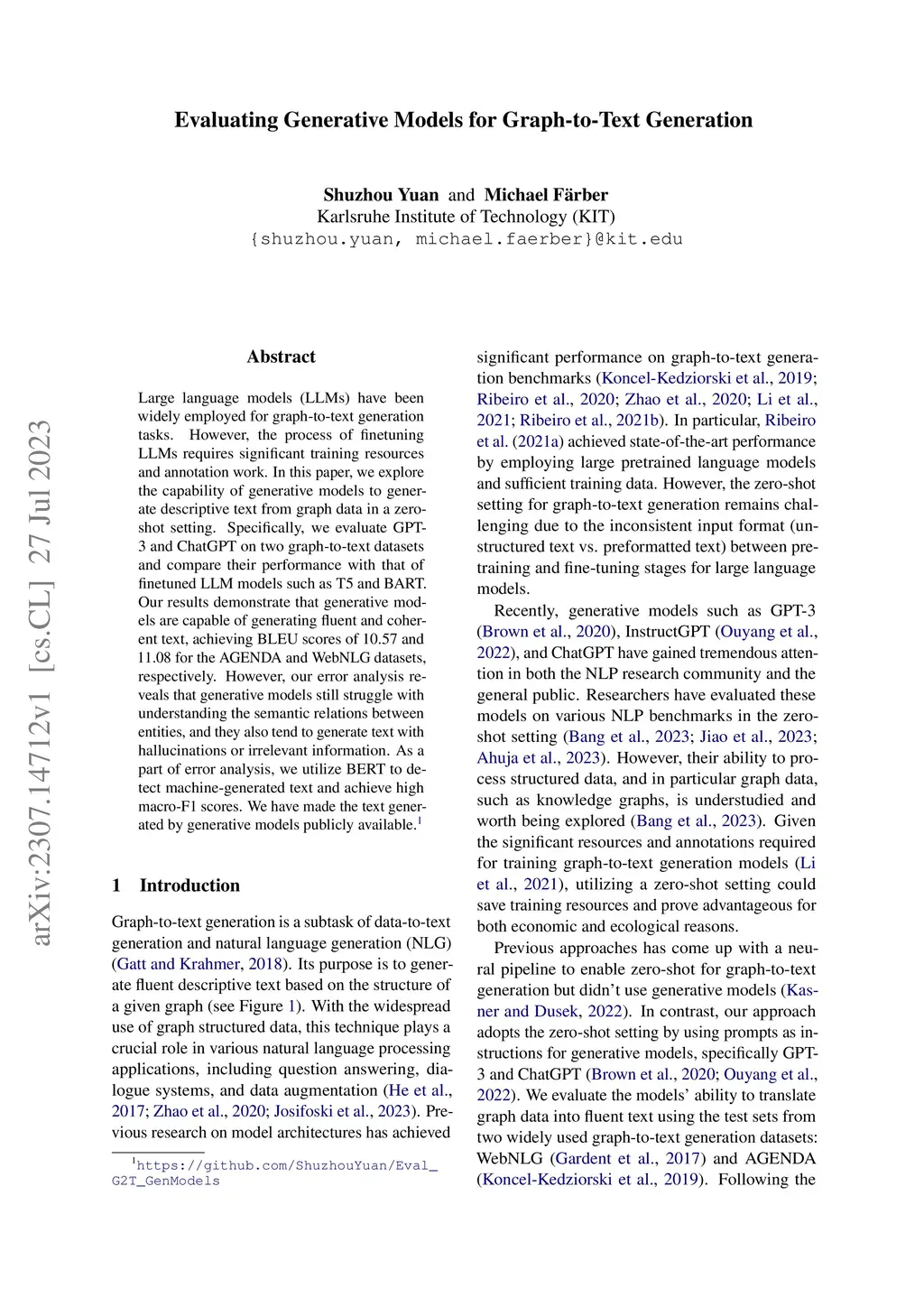 Large language models (LLMs) have been widely employed for graph-to-text generation tasks. However, the process of finetuning LLMs requires significant training resources and annotation work. In this paper, we explore the capability of generative models to generate descriptive text from graph data in a zero-shot setting. Specifically, we evaluate GPT-3 and ChatGPT on two graph-to-text datasets and compare their performance with that of finetuned LLM models such as T5 and BART. Our results demonstrate that generative models are capable of generating fluent and coherent text, achieving BLEU scores of 10.57 and 11.08 for the AGENDA and WebNLG datasets, respectively. However, our error analysis reveals that generative models still struggle with understanding the semantic relations between entities, and they also tend to generate text with hallucinations or irrelevant information. As a part of error analysis, we utilize BERT to detect machine-generated text and achieve high macro-F1 scores. We have made the text generated by generative models publicly available.