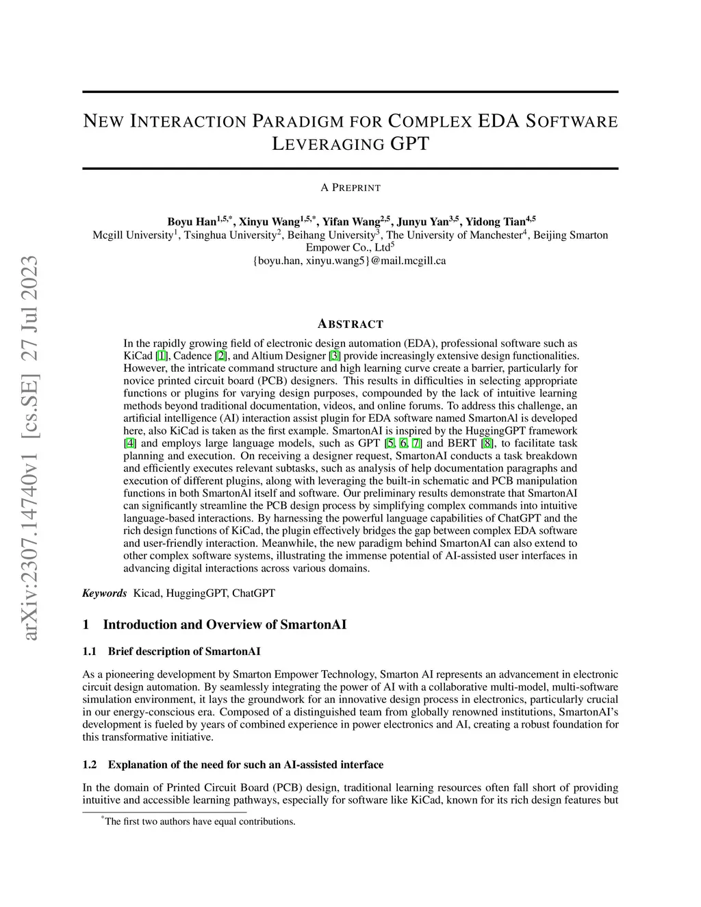 Electronic Design Automation (EDA) tools such as KiCad offer powerful functionalities but remain difficult to use, particularly for beginners, due to their steep learning curves and fragmented documentation. To address this challenge, we present SmartonAI, an AI-assisted interaction system that integrates large language models into the EDA workflow, enabling natural language communication, intelligent task decomposition, and contextual plugin execution. SmartonAI consists of two main components: a Chat Plugin that breaks down user instructions into subtasks and retrieves tailored documentation, and a OneCommandLine Plugin that recommends and executes relevant plugins based on user intent. The system supports multilingual interaction and adapts to user feedback through incremental learning. Preliminary results suggest that SmartonAI significantly reduces onboarding time and enhances productivity, representing a promising step toward generalizable AI-assisted interaction paradigms for complex software systems.