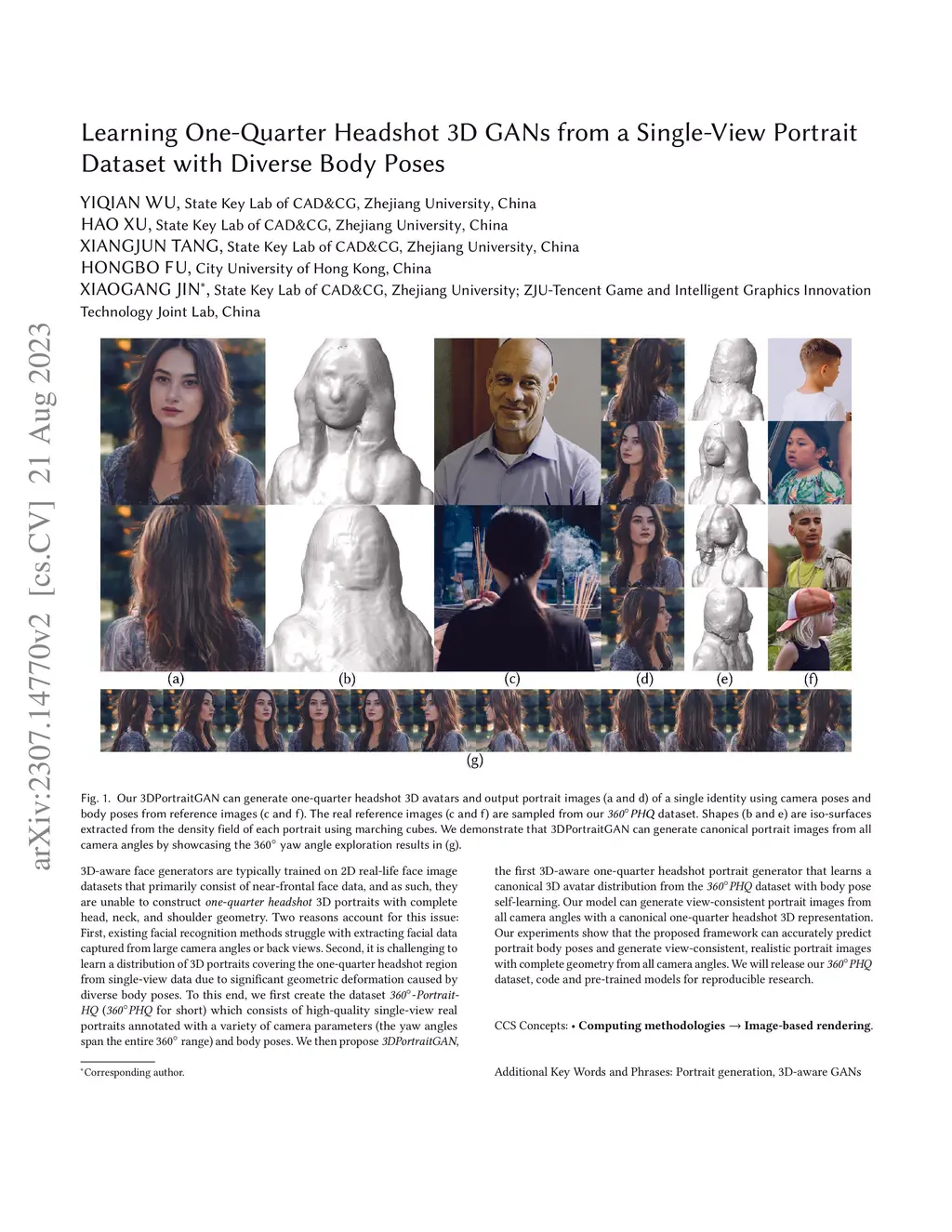 3D-aware face generators are typically trained on 2D real-life face image datasets that primarily consist of near-frontal face data, and as such, they are unable to construct one-quarter headshot 3D portraits with complete head, neck, and shoulder geometry. Two reasons account for this issue: First, existing facial recognition methods struggle with extracting facial data captured from large camera angles or back views. Second, it is challenging to learn a distribution of 3D portraits covering the one-quarter headshot region from single-view data due to significant geometric deformation caused by diverse body poses. To this end, we first create the dataset 360°-Portrait-HQ (360°PHQ for short) which consists of high-quality single-view real portraits annotated with a variety of camera parameters (the yaw angles span the entire 360° range) and body poses. We then propose 3DPortraitGAN, the first 3D-aware one-quarter headshot portrait generator that learns a canonical 3D avatar distribution from the 360°PHQ dataset with body pose self-learning. Our model can generate view-consistent portrait images from all camera angles with a canonical one-quarter headshot 3D representation. Our experiments show that the proposed framework can accurately predict portrait body poses and generate view-consistent, realistic portrait images with complete geometry from all camera angles.