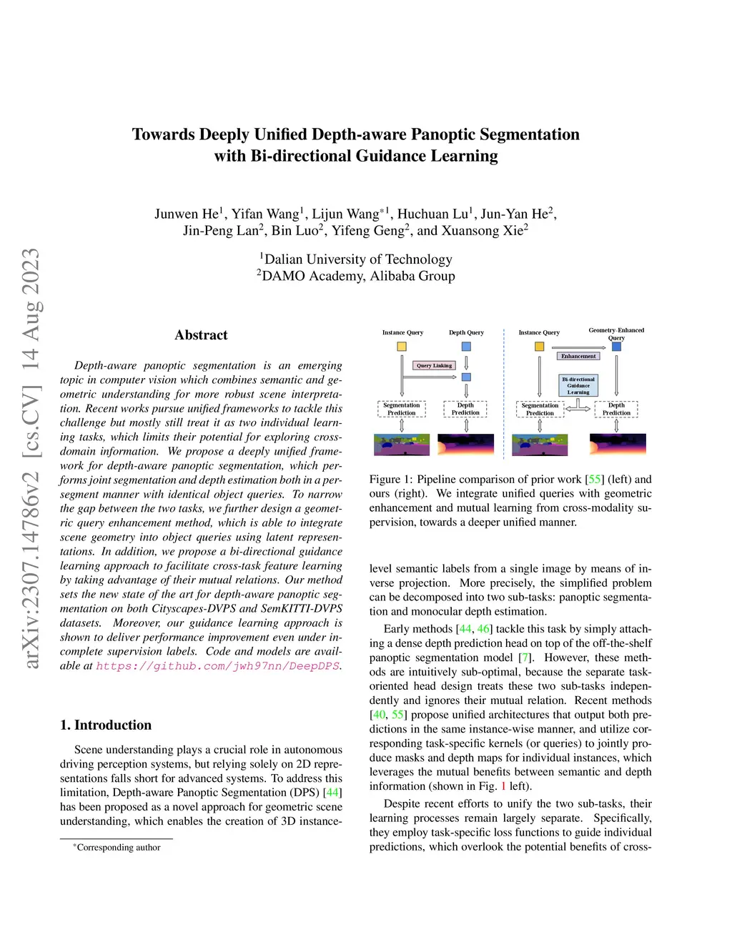 Depth-aware panoptic segmentation is an emerging topic in computer vision which combines semantic and geometric understanding for more robust scene interpretation. Recent works pursue unified frameworks to tackle this challenge but mostly still treat it as two individual learning tasks, which limits their potential for exploring cross-domain information. We propose a deeply unified framework for depth-aware panoptic segmentation, which performs joint segmentation and depth estimation both in a per-segment manner with identical object queries. To narrow the gap between the two tasks, we further design a geometric query enhancement method, which is able to integrate scene geometry into object queries using latent representations. In addition, we propose a bi-directional guidance learning approach to facilitate cross-task feature learning by taking advantage of their mutual relations. Our method sets the new state of the art for depth-aware panoptic segmentation on both Cityscapes-DVPS and SemKITTI-DVPS datasets. Moreover, our guidance learning approach is shown to deliver performance improvement even under incomplete supervision labels.