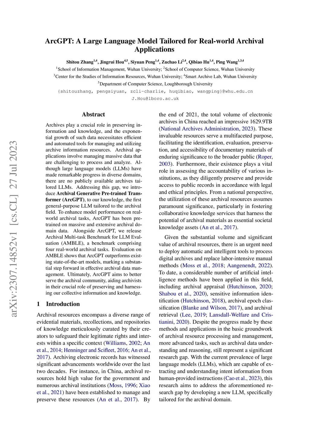 Archives play a crucial role in preserving information and knowledge, and the exponential growth of such data necessitates efficient and automated tools for managing and utilizing archive information resources. Archival applications involve managing massive data that are challenging to process and analyze. Although LLMs have made remarkable progress in diverse domains, there are no publicly available archives tailored LLM. Addressing this gap, we introduce ArcGPT, to our knowledge, the first general-purpose LLM tailored to the archival field. To enhance model performance on real-world archival tasks, ArcGPT has been pre-trained on massive and extensive archival domain data. Alongside ArcGPT, we release AMBLE, a benchmark comprising four real-world archival tasks. Evaluation on AMBLE shows that ArcGPT outperforms existing state-of-the-art models, marking a substantial step forward in effective archival data management. Ultimately, ArcGPT aims to better serve the archival community, aiding archivists in their crucial role of preserving and harnessing our collective information and knowledge.