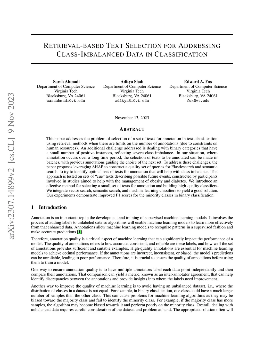 This paper addresses the problem of selecting of a set of texts for annotation in text classification using retrieval methods when there are limits on the number of annotations due to constraints on human resources. An additional challenge addressed is dealing with binary categories that have a small number of positive instances, reflecting severe class imbalance. In our situation, where annotation occurs over a long time period, the selection of texts to be annotated can be made in batches, with previous annotations guiding the choice of the next set. To address these challenges, the paper proposes leveraging SHAP to construct a quality set of queries for Elasticsearch and semantic search, to try to identify optimal sets of texts for annotation that will help with class imbalance. The approach is tested on sets of cue texts describing possible future events, constructed by participants involved in studies aimed to help with the management of obesity and diabetes. We introduce an effective method for selecting a small set of texts for annotation and building high-quality classifiers. We integrate vector search, semantic search, and machine learning classifiers to yield a good solution. Our experiments demonstrate improved F1 scores for the minority classes in binary classification.
