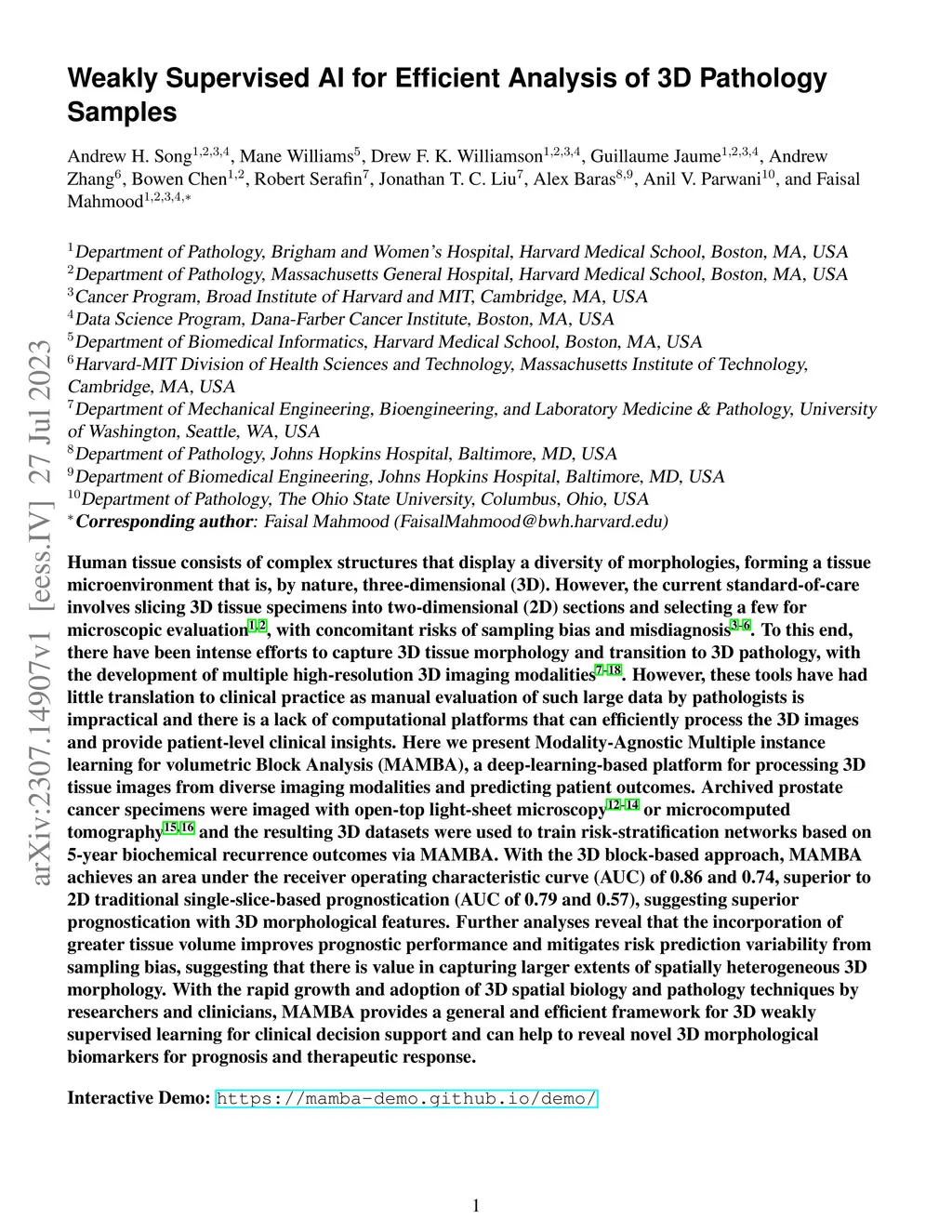 Weakly Supervised AI for Efficient Analysis of 3D Pathology Samples