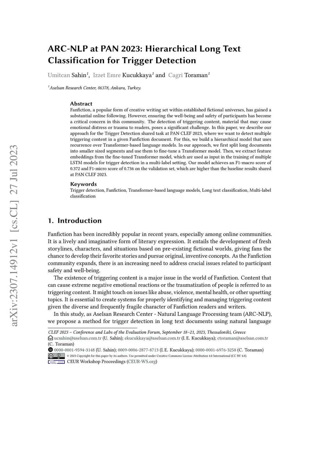 ARC-NLP at PAN 2023: Hierarchical Long Text Classification for Trigger